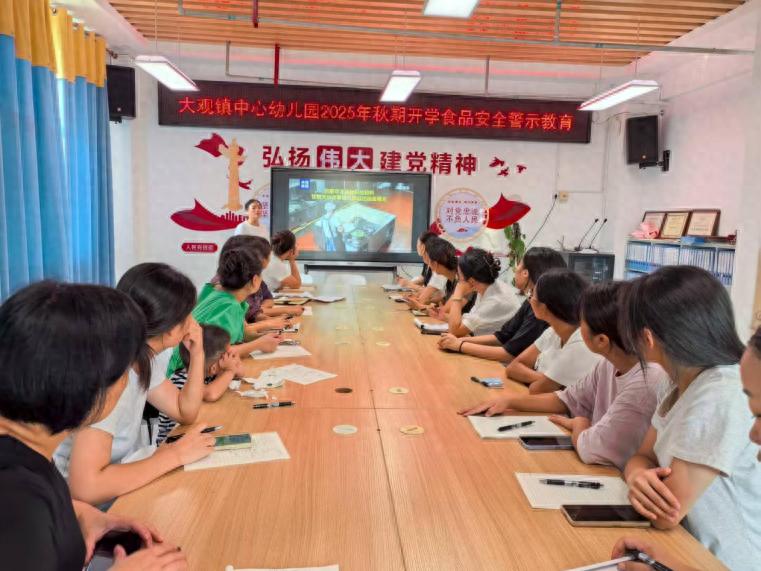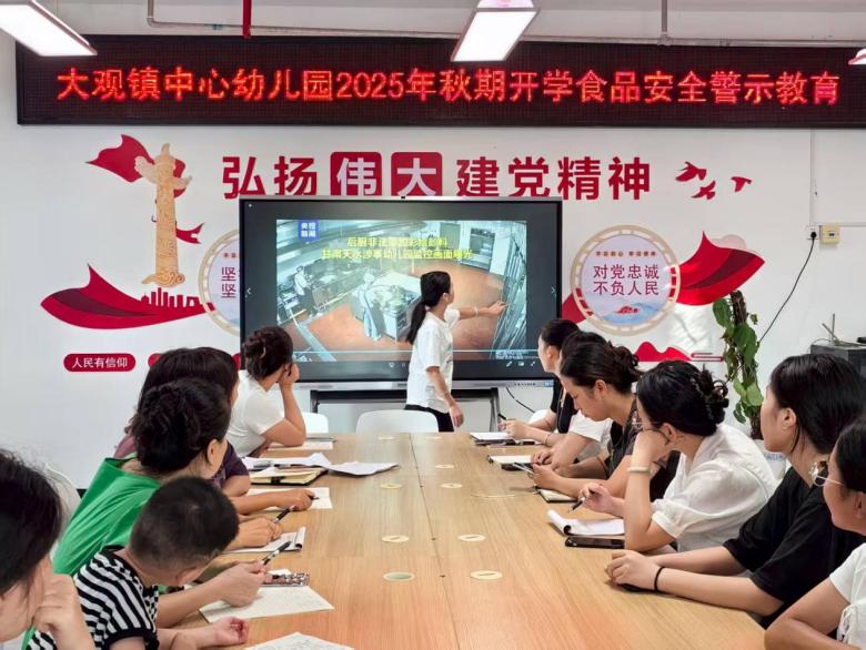新学期伊始,为进一步加强幼儿园食品安全管理,提升全体教职工食品安全意识,2025年8月27日,宜宾市南溪区大观镇中心幼儿园组织开展了食品安全警示片学习及开学食品安全培训活动。本次活动由幼儿园后勤主任陈燕主持,全体教职工共同参与。