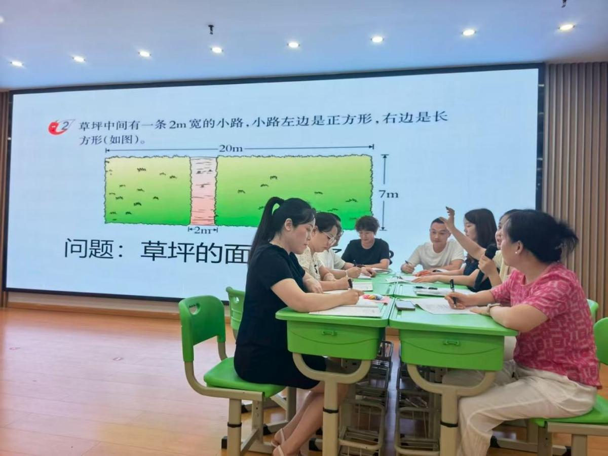 活动伊始,刘学名师工作室以“求中间有小路的长方形草坪的面积”为载体,还原真实课堂教学。在问题导入环节,遵循“情境—认知—结构”逻辑,引导学生联系生活案例,通过圈画信息、分析图形结构,建立数学问题与现实场景的关联。方法研讨阶段,老师们呈现多元教学策略:袁丽平老师基于“几何图形分割与整合”理论,系统阐释“分块求和”、“整体减空白”和“平移转化”三种解题路径;陈蓉老师针对不同学情,践行分层教学理念,模拟“自主标注→阶梯引导→方法迁移”教学流程,探索差异化教学实施路径;刘都老师依托合作学习理论,组织小组研讨与成果汇报,创新“乾坤大挪移”的趣味命名策略;尹飞老师提炼“问题引入→小组探究→板书展示→教师总结”共性教学流程,强调数学语言规范性的教学价值。