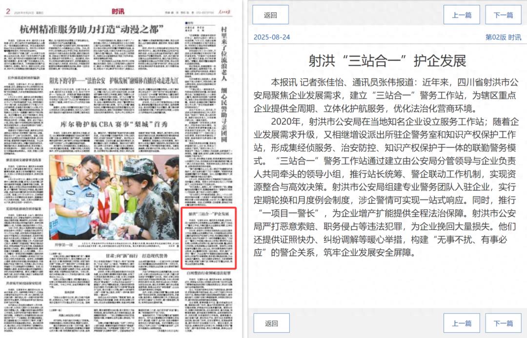 8月24日,人民公安报刊登报道《射洪“三站合一”护企发展》一文,简单叙述了射洪公安建立“三站合一”警务工作站的运行机制与作用,聚焦企业发展需求,为辖区重点企业提供了全周期、立体化护航服务,优化法治化营商环境。