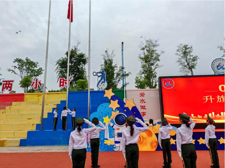 庄严的升旗仪式上,南溪区长江学校全体师生肃立行礼,注视五星红旗冉冉升起,嘹亮国歌声中涌动着对祖国的热爱与敬意。