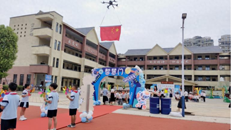 最令人期待的莫过于一年级新生入场仪式。伴随着轻快的音乐,一年级的小萌新们排着整齐的队伍,穿过智慧门沿着红毯走来。红毯两侧,四年级哥哥姐姐们手持七彩花热烈欢迎,微笑致意。更引人注目的是,一架无人机高擎五星红旗在空中领航,稳稳地引领队伍前进,科技感和爱国氛围十足。孩子们跟随着国旗的方向,一步步融入长江学校这个大家庭。国旗绕场一周,在阳光下熠熠生辉,既让新生感受到了校园的广阔与温暖,更在他们心中播下了爱国的种子——国旗所至,皆是信仰;科技护航,皆是力量!