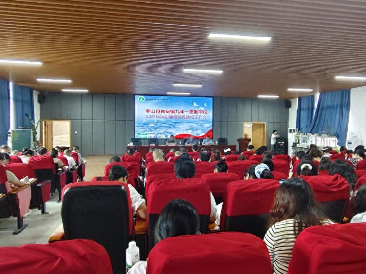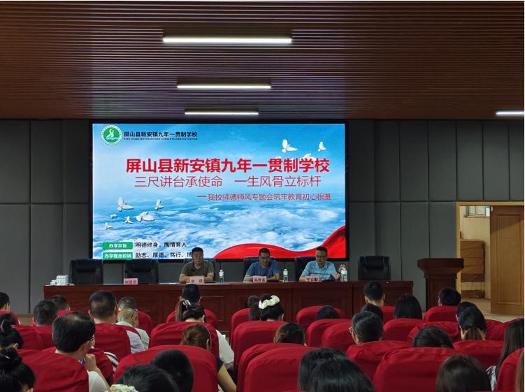 春风化雨润桃李,德润杏坛铸师魂。为深入贯彻落实立德树人根本任务,扎实推进新时代教师队伍建设,以高尚师德引领教育高质量发展,2025年8月26日上午,屏山县新安镇九年一贯制学校召开了师德师风专题会议,全体教职工齐聚一堂,以“守师德底线、筑育人高地”为核心,在思想淬炼中凝聚共识,在使命传承中明确方向,为新学期教育事业开篇定向、凝心聚力,同时为师德师风建设定方向、明要求、强举措。