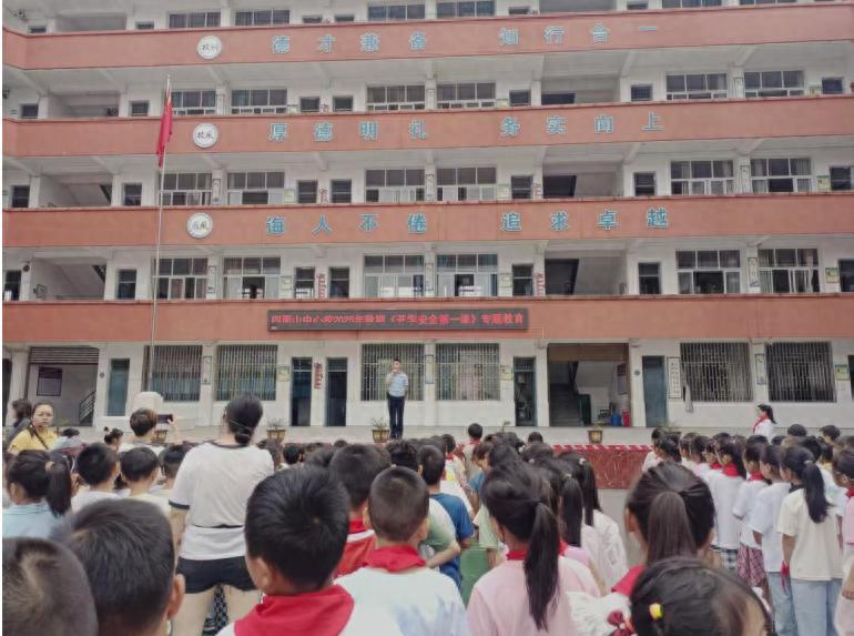 新学期伊始,为切实增强师生的法治观念和安全意识,筑牢安全防线。江安县四面山镇中心小学校在2025年9月1日这天特别邀请四面山镇派出所民警彭秋涛进校园,为全体师生带来了一场干货满满的开学安全法治教育课。