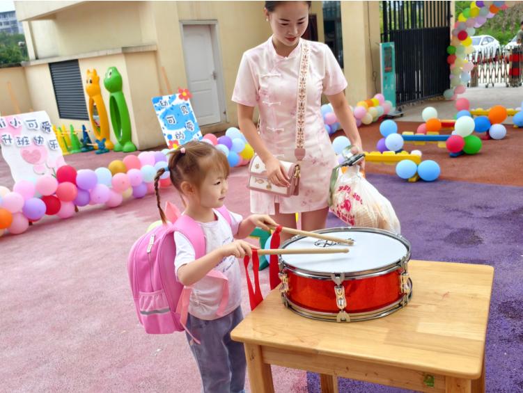 一进园,孩子们跨过一排排小跨栏,迈向新学期新旅程,大家鼓足劲儿,就像小战士一样勇敢,每一步都带着对新学期的期待。敲敲小鼓,一鼓作气;摸摸苹果,平平安安;摸摸橘子,大吉大利;摸摸大葱,聪明伶俐,充满仪式感的“摸彩头”让孩子们切身感受到祝福:祝福他们在新的学期里勇往直前、平安顺遂、聪明伶俐,开心健康!