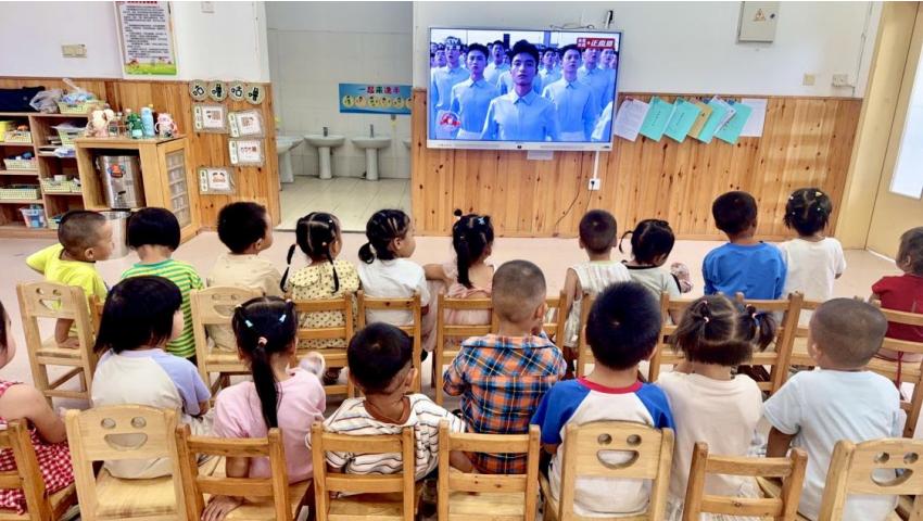天安门广场旌旗飘扬,千里之外的夕佳山幼儿园里,孩子们澄澈的眼睛注视着屏幕上的同一幕,一种无声的力量在幼小的心灵里生根发芽。