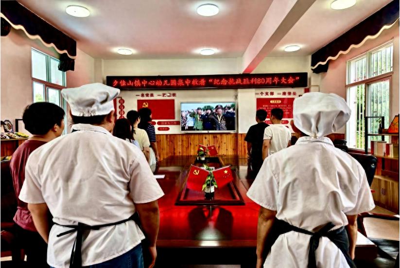 2025年9月3日上午9:00,江安县夕佳山镇中心幼儿园组织全体教职工和幼儿集体观看了纪念中国人民抗日战争暨世界反法西斯战争胜利80周年阅兵仪式直播。