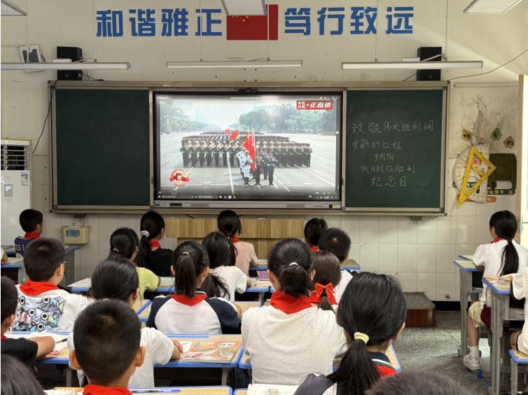 为铭记历史、缅怀先烈、珍爱和平、开创未来,深刻感受国家富强、民族振兴的宏伟气象,激发全体师生的爱国热情和民族自豪感。9月3日上午,宜宾市南溪区黄沙镇中心小学校组织全校师生观看了“纪念中国人民抗日战争暨世界反法西斯战争胜利80周年阅兵仪式”现场直播。