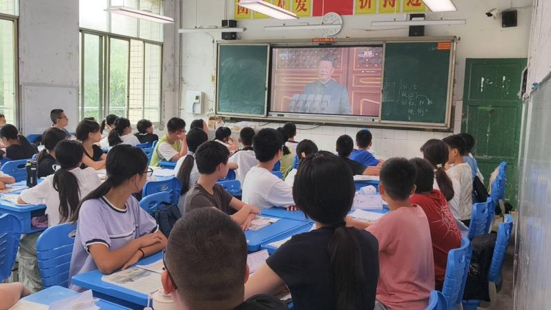 2025年9月3日上午9:00,纪念中国人民抗日战争暨世界反法西斯战争胜利80周年阅兵式在北京天安门广场盛大启幕。宜宾市南溪区桂溪初级中学校德育处迅速响应,精心组织全校师生在各班教室,共同观看了这场意义非凡的阅兵仪式直播,一同见证这一庄严肃穆的伟大时刻。