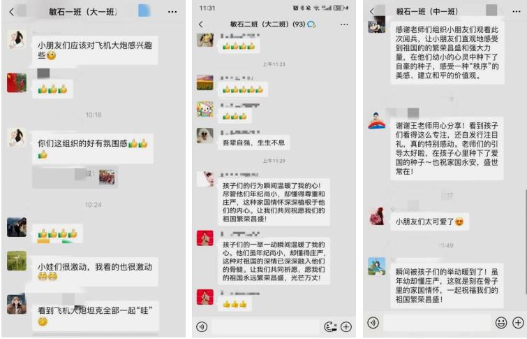 活动结束后,三江新区马鞍石幼儿园收到了众多家长的积极反馈。字里行间既有对孩子成长的欣慰,更有对家园共育理念的高度认同。教育不是孤立的努力,而是家庭与幼儿园携手同行的旅程。感谢每一位家长以陪伴点亮孩子的爱国之心,让我们继续同心同向、合育共融,让民族自豪感深深融入每一个孩子的血脉。