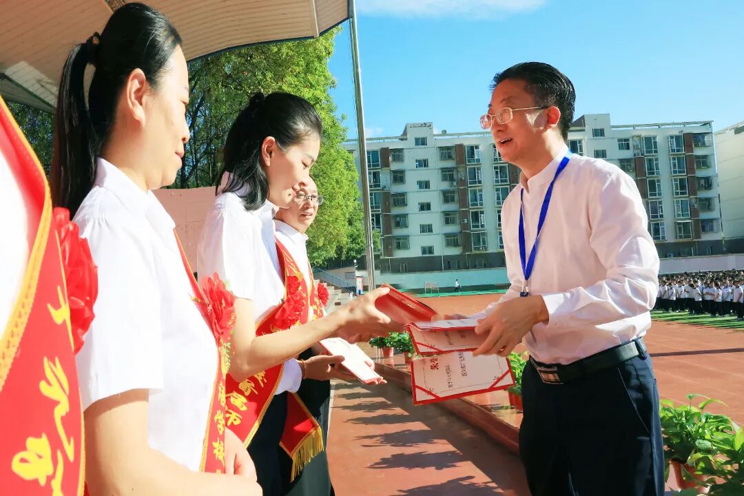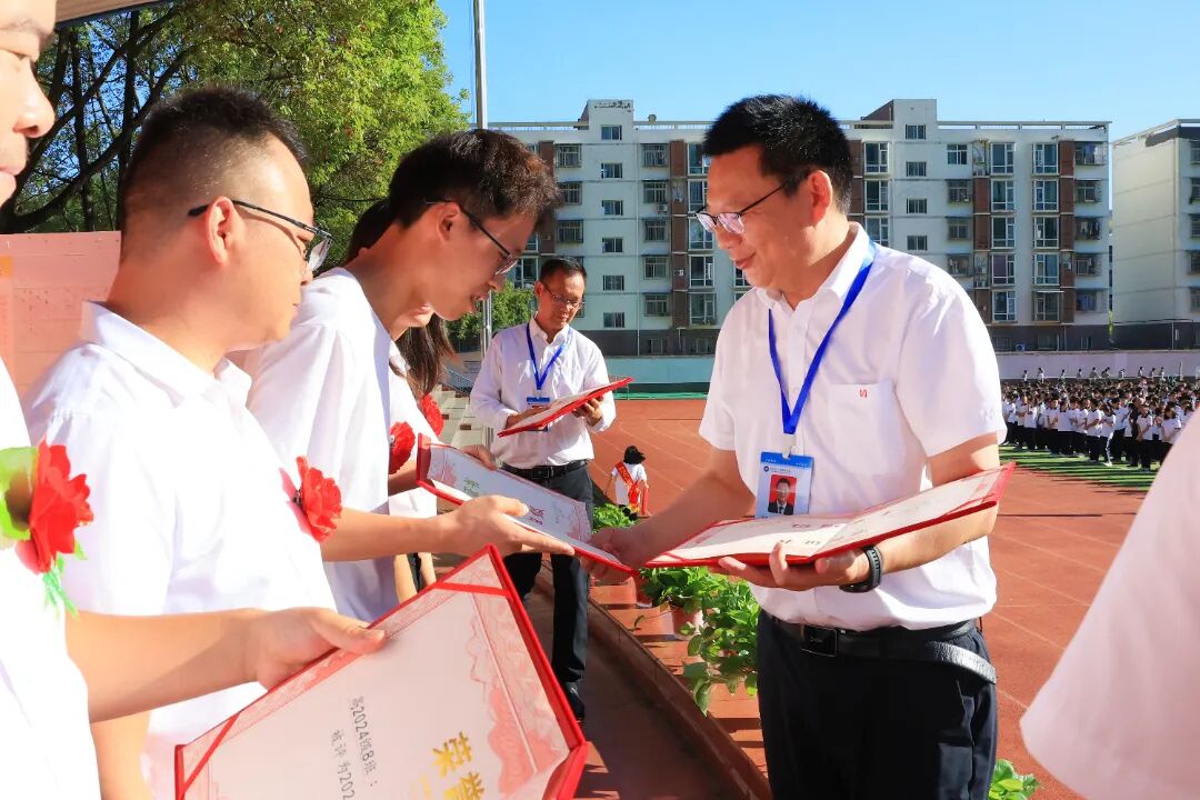 副校长陈子卫、何凯胜,廉勤委主任王军分别宣读学校关于表彰2024-2025学年优秀学生、平安班级、师德标兵的决定并主持颁奖仪式,学校领导为受到表彰的人员颁奖。