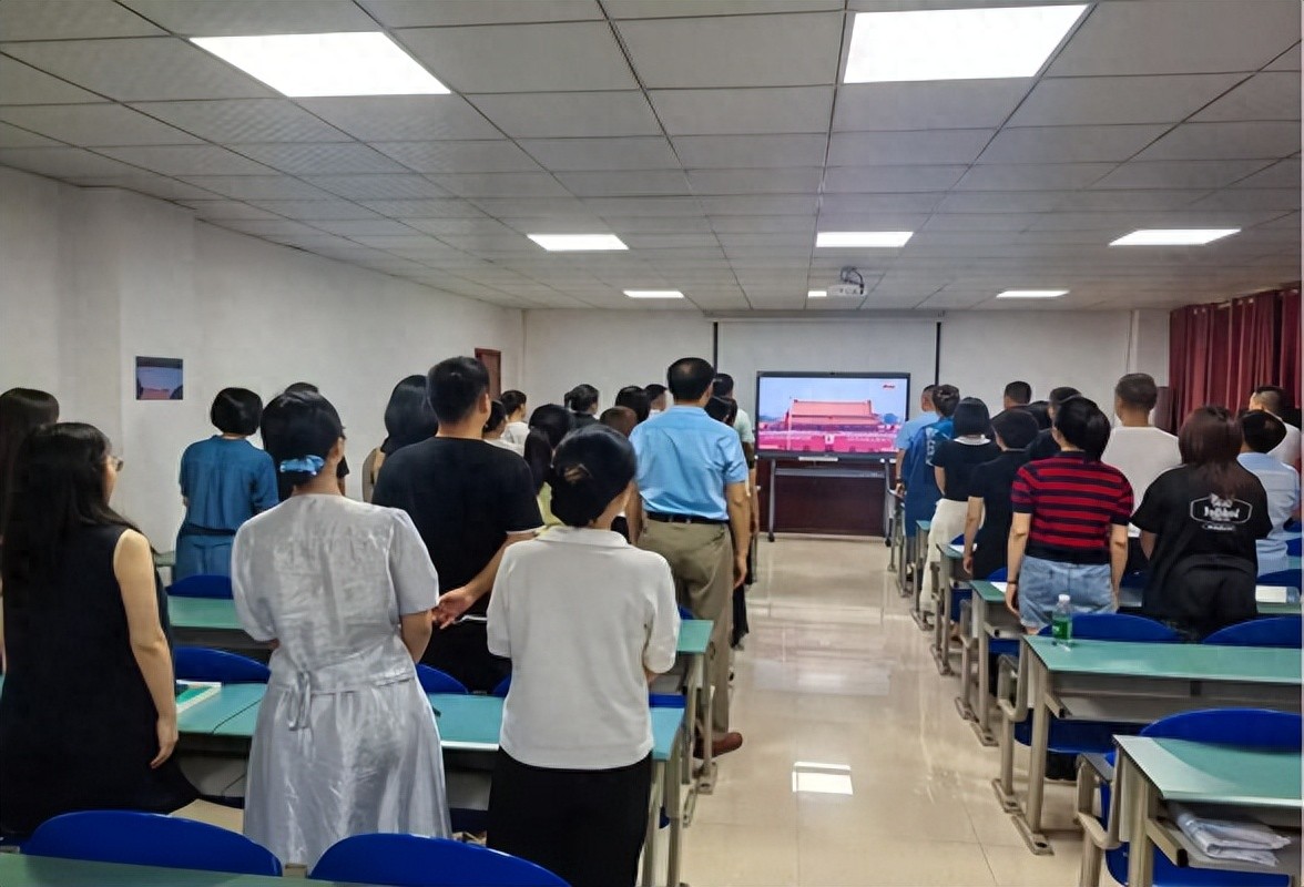 △纪念大会开始,随着庄严的国歌声响起,全体人员肃立齐唱国歌!
