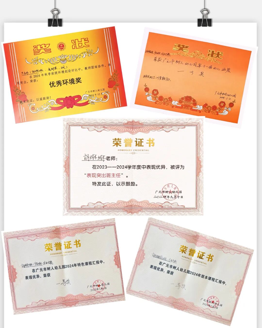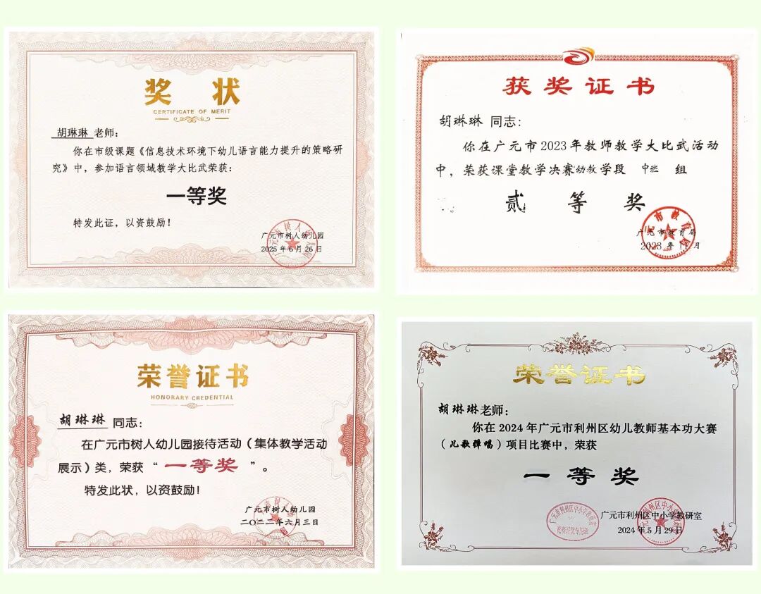 对孩子的深爱,化作了胡老师追求卓越专业能力的不竭动力。从事幼教工作以来,她从未停止学习的脚步。工作的每一年,她屡获佳绩,班级多次荣获园级“优秀环创奖”“班本课程汇报一等奖”“美育课程汇报一等奖”等奖项,个人更被评为利州区表现突出教师、幼儿园优秀班主任等荣誉称号。