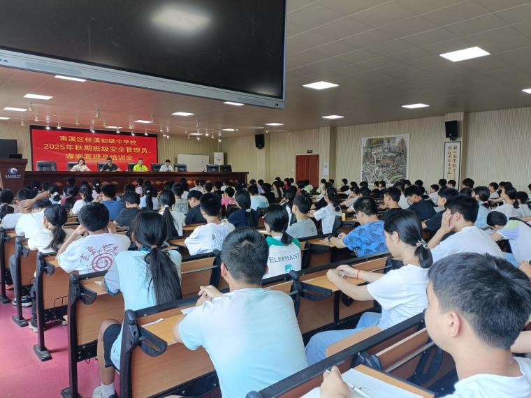 为夯实校园安全管理基层力量,构建“人人讲安全、个个会应急”的校园环境,2025年9月9日中午,宜宾市南溪区桂溪初级中学校在学术报告厅组织召开了全校班级及寝室安全员专题培训会。