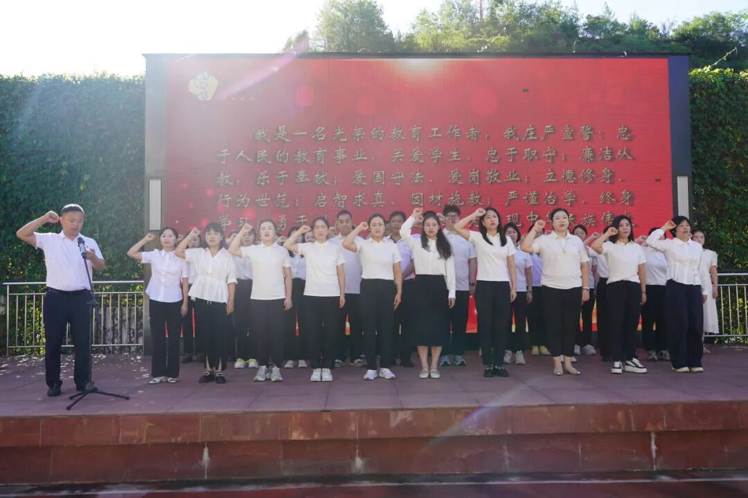 随后,在宫高强书记的带领下,全体教师举起右拳,庄严宣誓:“我是一名光荣的教育工作者,我庄严宣誓:忠于人民的教育事业,关爱学生、忠于职守;廉洁从教,乐于奉献;爱国守法、爱岗敬业;立德修身、行为世范;启智求真、因材施教;严谨治学、终身学习;勇于创新、奋发进取,为实现中华民族伟大复兴贡献全部智慧和力量。”铿锵誓言回荡校园,不仅是教师们对职业操守的公开承诺,更是对特殊孩子和教育事业的深情告白。