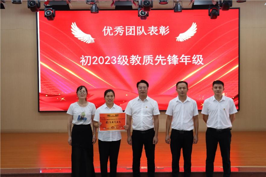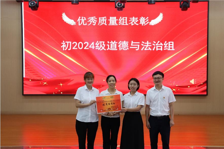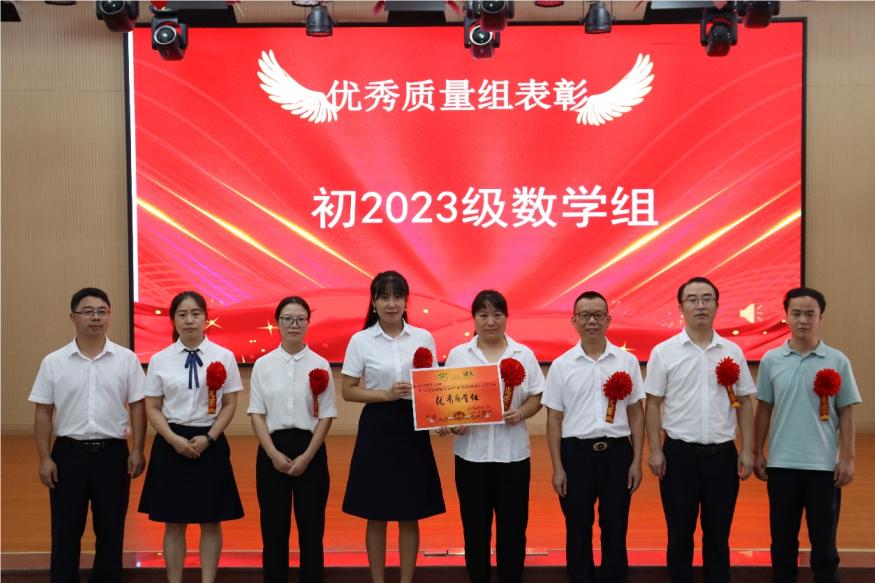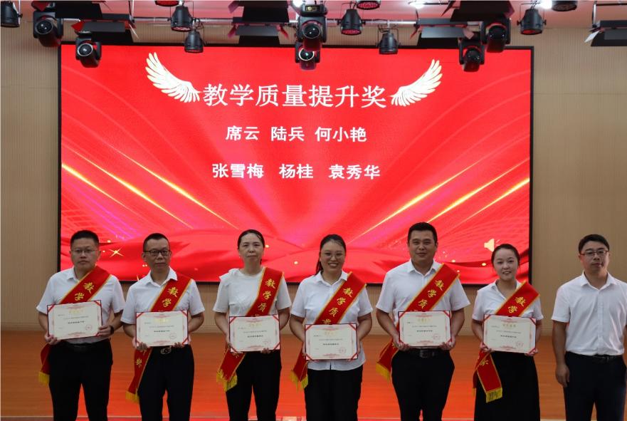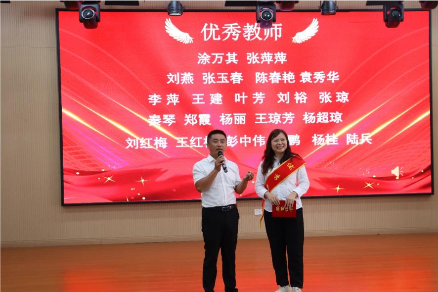 致辞结束后,颁奖典礼正式开启。本次活动紧扣表彰主题,旨在树立榜样、激励先进,表彰名单涵盖个人与集体多个类别:对黄丽娟等5名“优秀教育工作者”、余浩等3名“师德标兵”、陈文等3名 “优秀宣传员”、姚兴梅等4名“优秀班主任”、王红梅等12名“优秀教师”、蒋红平等5名“服务标兵”、袁秀华等3名“竞技标兵”、应青秀等3名“优秀指导教师”、邱静波等2名“送生先进个人”予以表彰;为刘燕等14名教师颁发“教学质量特别奖”,为何小艳等6名教师颁发“教学质量提升奖”;授予初2023级数学质量组、初2024 级道德与法治质量组等5个质量组“优秀质量组”称号,授予初2023级年级组“教质先锋年级组”称号。学校领导依次为获奖个人与团队颁发荣誉证书。表彰环节中,“优秀教师”代表叶芳老师与大家分享了自己三十余年的教学感悟;“优秀质量组”代表陈春艳老师上台分享团队经验。