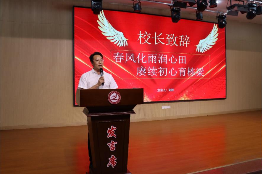 接着,学校党支部书记、校长刘波发表致辞。他代表学校向一线教职工致以节日祝贺与崇高敬意,高度肯定学校过去一年在教育教学、学科建设、学生管理等方面的优异成绩,表扬了业绩突出、勇于担当的教师代表,并对全体教师提出殷切期望,希望大家不忘初心、牢记使命,秉持立德树人根本任务,提升教学水平,为培养全面发展的社会主义建设者和接班人贡献力量。