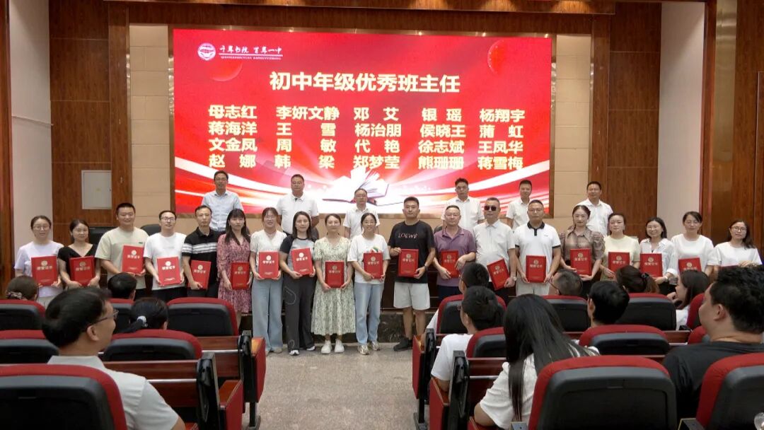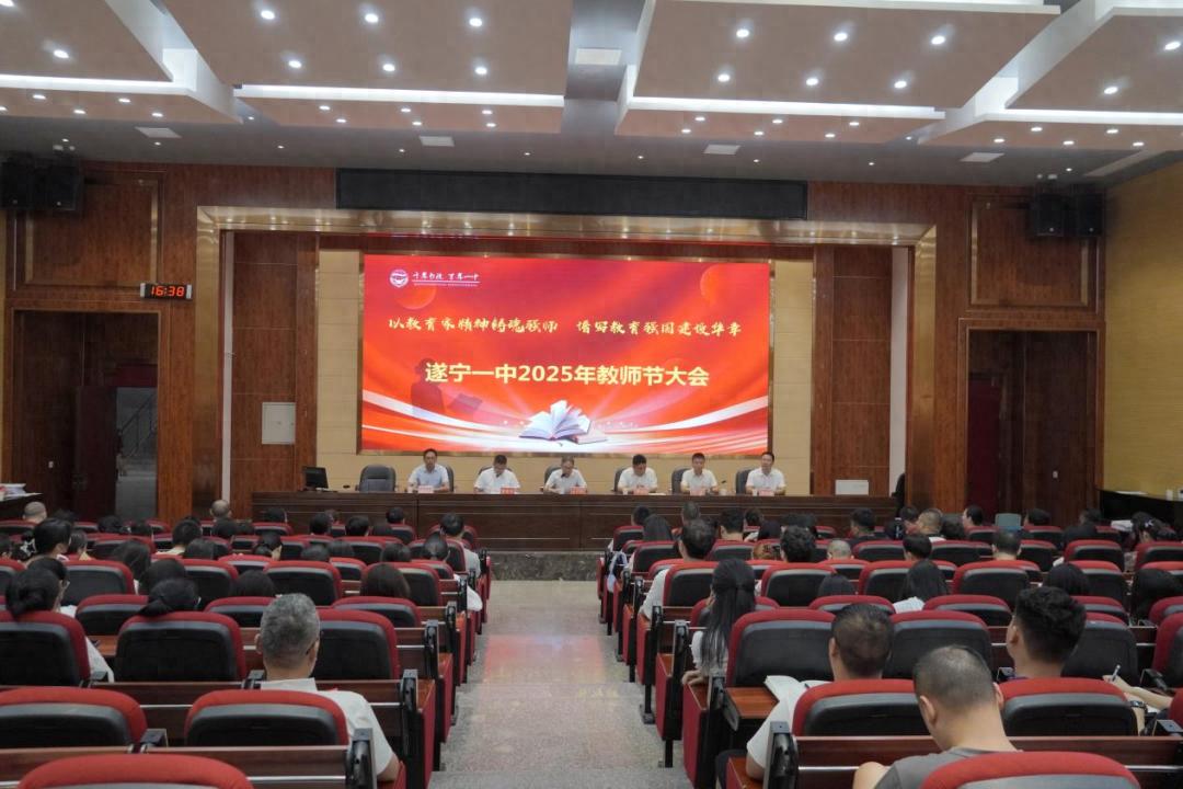 为传承伟大的抗战精神,弘扬尊师重教的良好风尚,在全国第41个教师节来临之际,9月9日下午,遂宁一中召开2025年庆祝教师节暨表扬大会。会议旨在弘扬尊师重教的优良传统,表扬先进、树立典型,进一步激发全体教职工的责任感与使命感,推动学校教育事业高质量发展。遂宁一中全体行政干部及2024-2025离退休教师、优秀班主任代表、优秀教师代表、优秀教育工作者代表、新入职教师参加会议。会议由学校党委副书记、纪委书记曾圣洪主持。