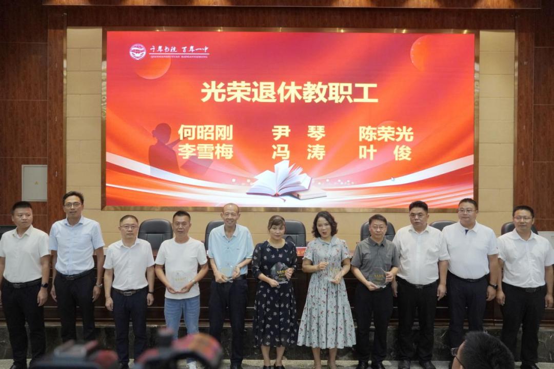 学校为2024年9月至2025年8月期间光荣退休的6名教职工举行了荣休仪式。学校党委副书记、校长邓再兵宣读了遂宁市教育局对6名退休教师的下发的正式文件,全体校级领导怀着崇高的敬意,为荣休教师们颁发了镌刻着“志缘桃李梦育才兴邦国百年一中点阵,情赋闲庭步荣休慢斟酌千年书院润心”的祝福语的纪念品,并合影留念。与会人员报以热烈的掌声,向全体荣休教师致以崇高敬意和最美好的祝福。本次荣休仪式,不仅是对退休教职工几十年如一日辛勤耕耘的高度认可,更是学校对教职工人文关怀的生动彰显。