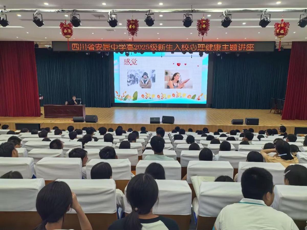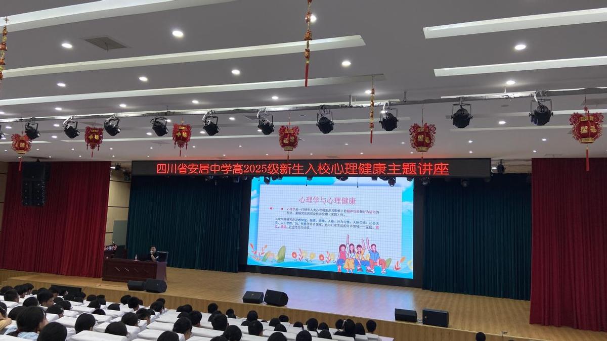 近日,遂宁市安居中学举办了以“心向阳光 快乐启航”为主题的高中新生入校心理健康专题讲座。本次讲座由学校专职心理教师伍洲主讲,旨在帮助新生更好地适应新环境、新学段的学习和生活,树立积极心态,提升心理调适能力。