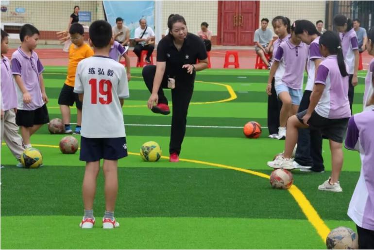 南溪区长江学校教师董宴在此次培训中承担示范课教学任务。课堂上,董宴老师以“盘带随心、传球到位”为核心,精心设计教学环节。在盘带教学部分,她借助新技术手段,通过播放专业足球运动员的盘带视频,让学生直观感受盘带技巧;随后,亲自示范并细致讲解动作要领,引导学生反复练习。传球教学时,董宴老师结合新教材理念,设计多样的传球练习活动,如小组传球接力、精准传球射门、教学比赛等,让学生在实践中掌握传球力度与方向的控制方法。