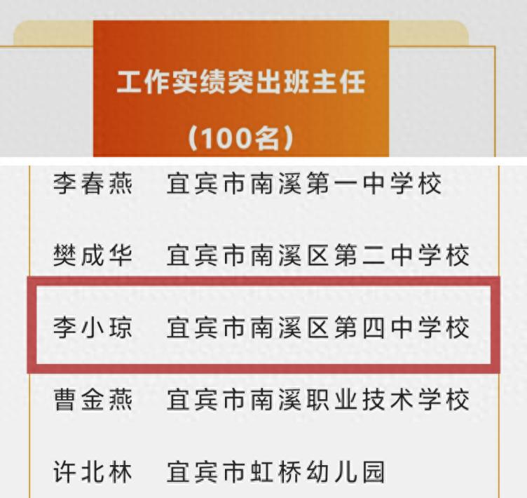 宜宾市南溪区第四中学校李小琼老师凭借其扎实的工作作风、突出的育人实绩和无私的奉献精神,荣获“全市教育工作实绩突出班主任”称号,获得市委、市政府的表彰!