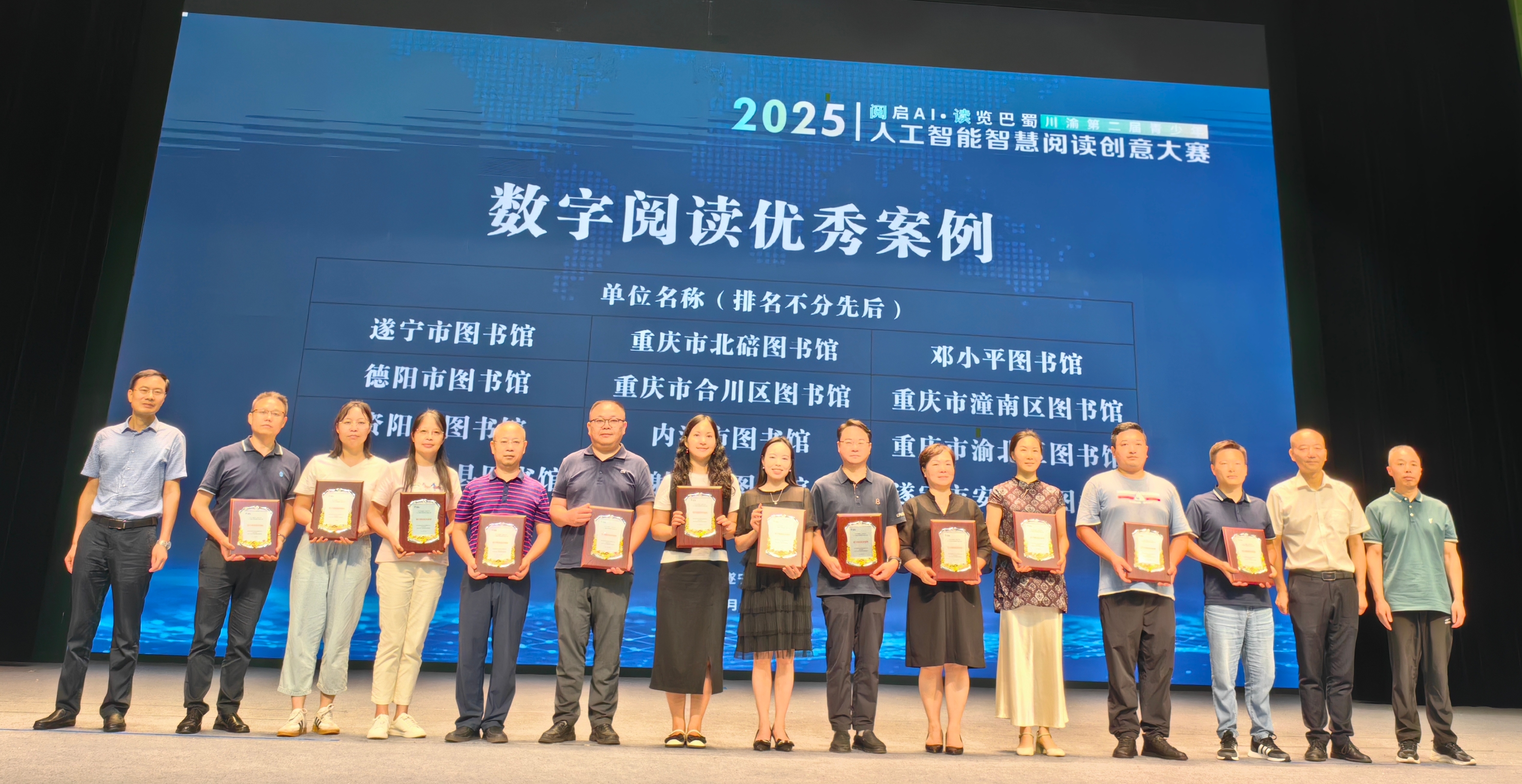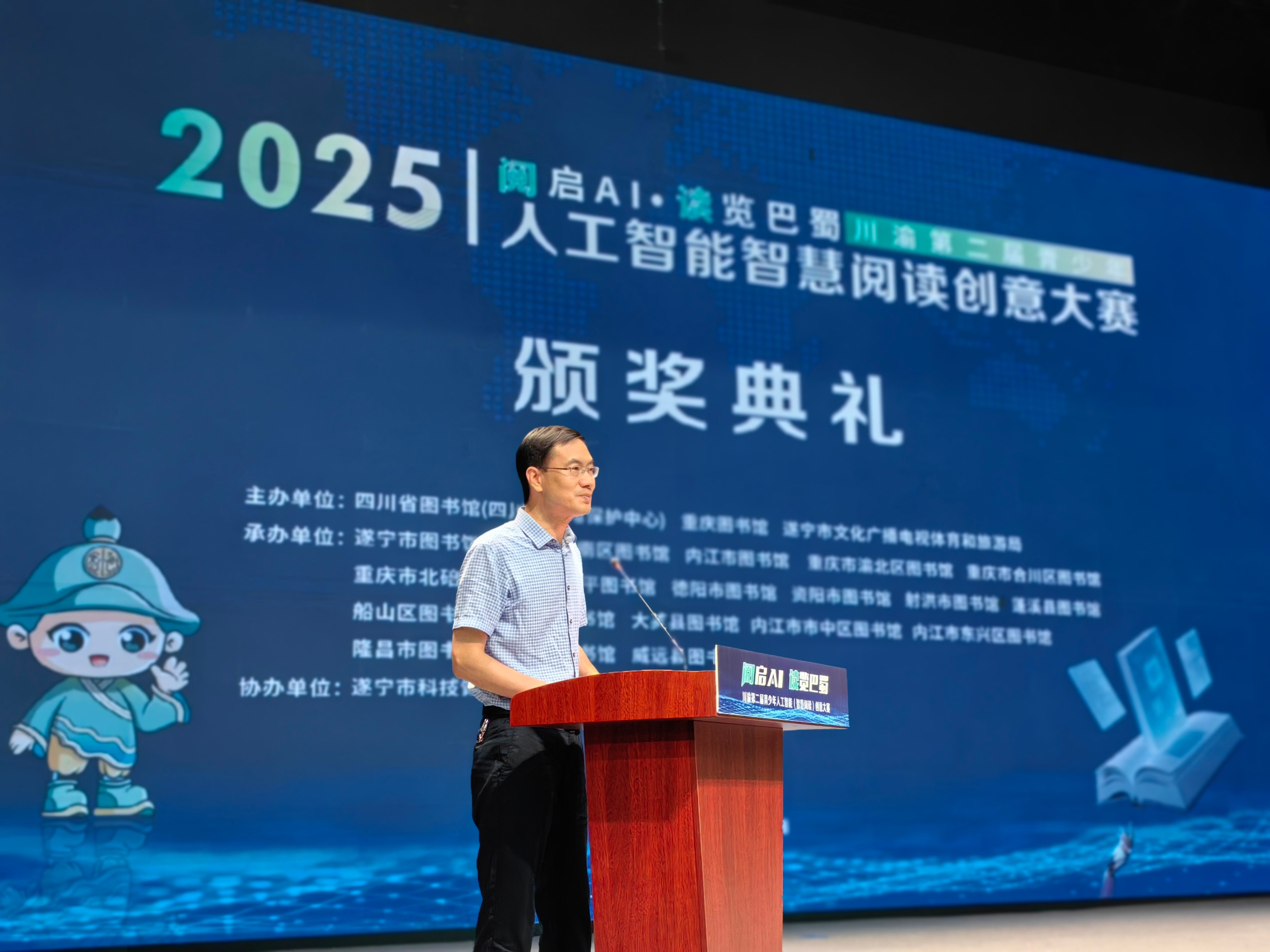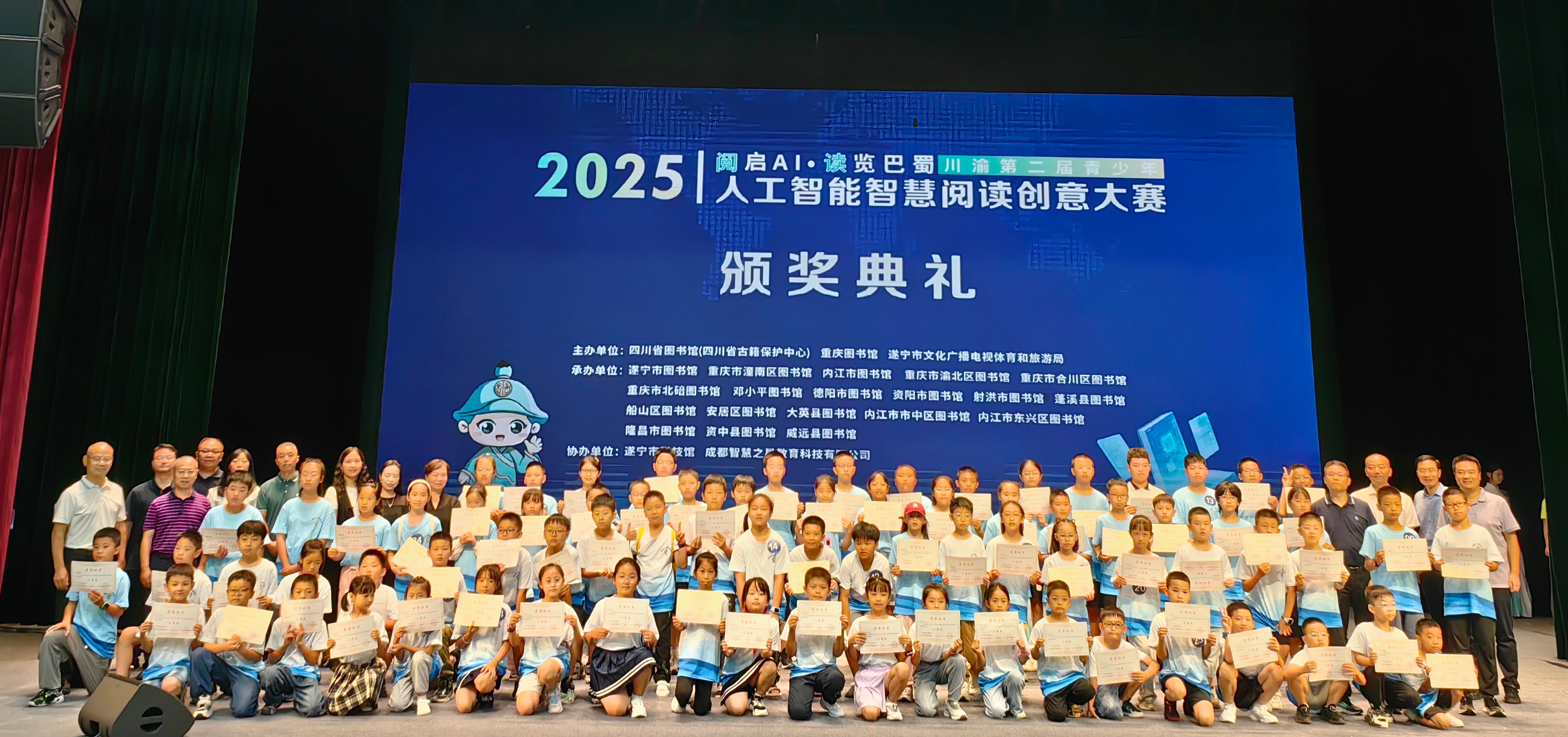 为贯彻落实省委十二届七次全会精神,积极响应成渝地区双城经济圈建设国家战略,展现川渝两地智慧图书馆建设水平,9月13日,遂宁市文化中心迎来了一场阅读与科技交融的盛会——2025川渝第二届青少年人工智能(智慧阅读)创意大赛总决赛。本次大赛由四川省图书馆、重庆图书馆、遂宁市文化广播电视体育和旅游局主办,遂宁市图书馆联合内江、资阳以及重庆潼南、合川等川渝地区20余家图书馆共同承办。
