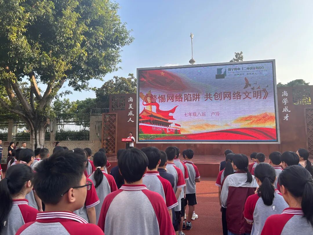 七年级八班的卢玲同学代表全体学生作了题为《警惕网络陷阱,共创网络文明》的国旗下讲话,从青少年视角分享了网络安全的重要性和日常防范措施。