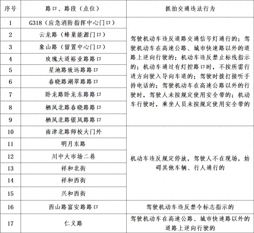一、交通违法电子警察抓拍路口、路段(点位)及抓拍交通违法行为: