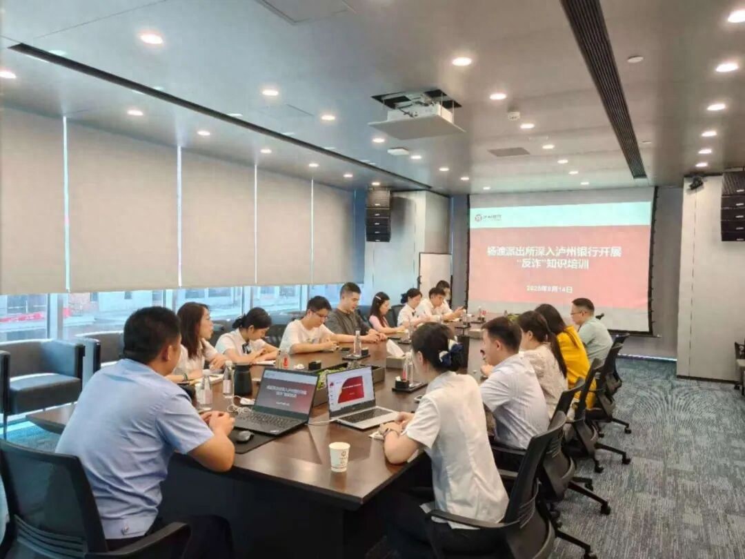 银行金融机构作为反诈战线中源头治理环节的主力担当,增强银行职员的预防电信网络诈骗意识刻不容缓。杨渡派出所深入辖区泸州银行遂宁支行开展“反诈”培训活动,民警从电信诈骗的特点、对电信网络诈骗的认知误区、常见的诈骗手法与可疑特征、常见诈骗套路等方面对电信诈骗的本质和特点进行了讲解,并就面对电信诈骗如何加强警银联动,为警方提供风险预警和劝阻服务提出了可操作性意见。