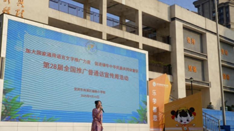 周一清晨,在庄严的升旗仪式中,南溪区福临小学校德育主任王美瑶以“普通话,连通你我;规范字,书写文明”为主题发表讲话,强调普通话作为国家通用语言在促进民族团结、传承中华文化中的重要作用。学生代表也以清晰流畅的普通话发起倡议:“让我们从小讲好普通话,用语言架起沟通的桥梁,用文字凝聚民族的力量!”