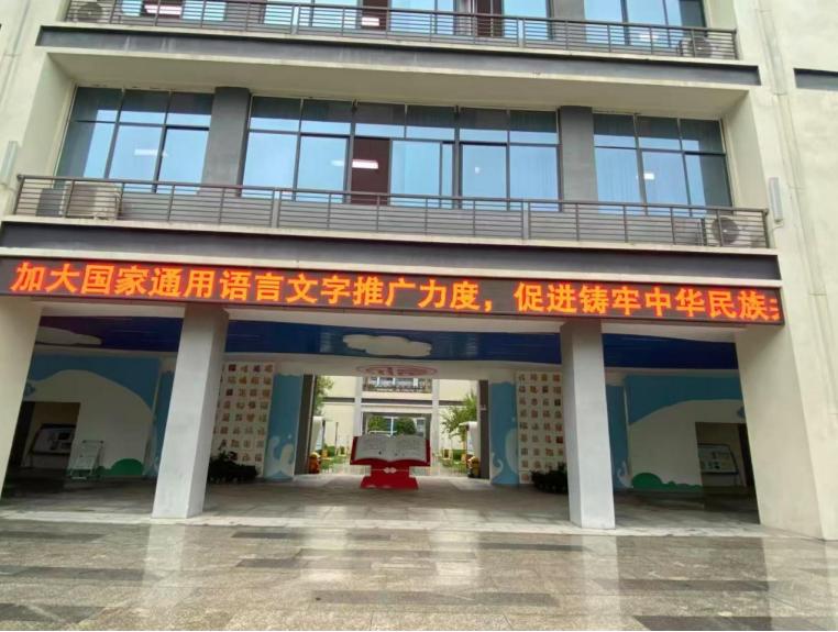 南溪区福临小学校校园内,LED屏幕滚动播放“同讲普通话,共建共同体”等宣传标语,楼道和班级文化墙布置了推普主题海报和学生的书法作品,既营造了浓厚的推普氛围,也展现了汉字与普通话的文化魅力。