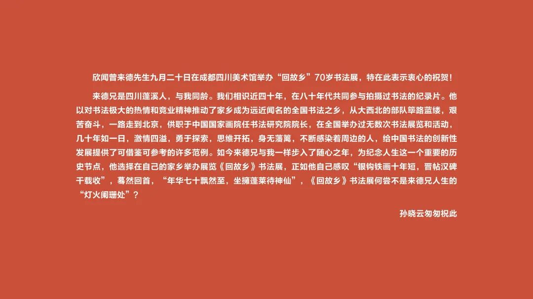 9月21日,由中国国家画院、中国文化艺术发展促进会、四川省文化和旅游厅、四川省文学艺术界联合会、四川美术学院联合主办,中国国家画院书法篆刻所、四川省政协书画研究院、四川省诗书画院、四川美术馆共同承办的“回故乡——曾来德书法艺术展”在四川美术馆开幕。本次展览精选曾来德先生近年创作的83件代表作,既有气势恢宏的巨幅作品,也有精巧雅致的尺牍小品,系统呈现了他扎根巴蜀文化土壤、持续突破创新的艺术探索。展览既是艺术家对家乡的深情献礼,也是传统书法艺术与现代美学理念的深度碰撞,更是四川文化艺术界的一件盛事。
