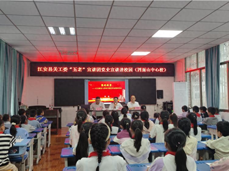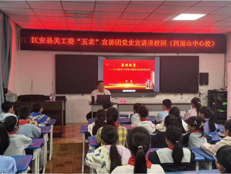 2025年9月23日,江安县关工委组织“五老”宣讲团到四面山镇中心小学校开展党史宣讲进校园活动,县关工委“五老”宣讲团宣讲员、县人大机关三级调研员洪波老师围绕"黎明时的较量——青峰寺剿匪英雄事迹及革命精神”主题进行宣讲。80余名师生聆听了宣讲。