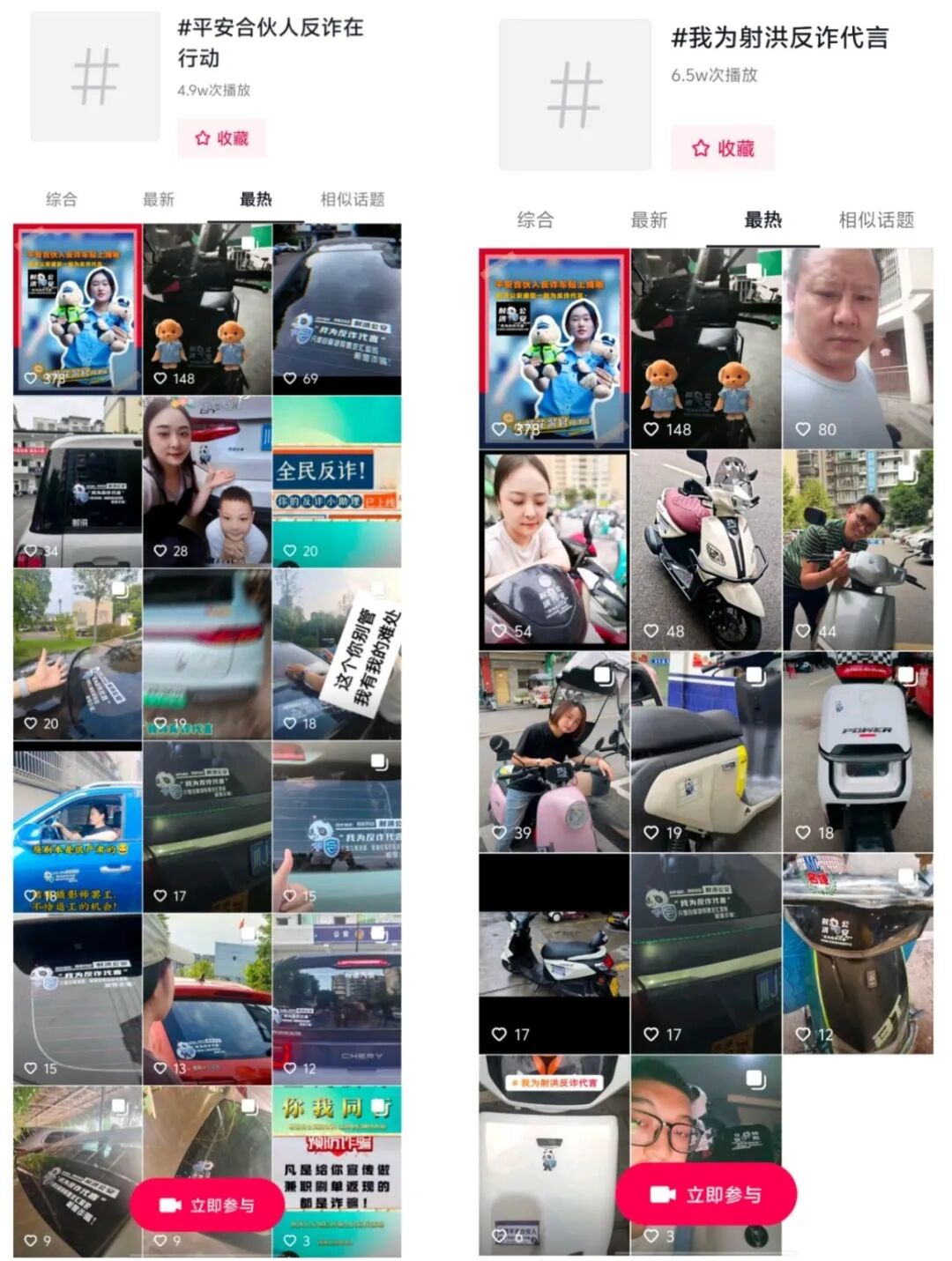 射洪公安反诈宣传工作不仅线下奔走,还积极线上发声,通过在抖音建立“平安合伙人反诈在行动”“我为射洪反诈代言”两个话题,发动反诈代言人创作带有反诈车贴的抖音短视频,转发权威反诈提示、分享真实案例、带动身边人共同提升防骗意识,实现“一人带动一片”的辐射效应。截至目前,已发动群众拍摄制作反诈视频40余个,累计播放量30余万次。
