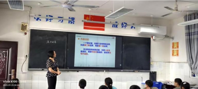 第二节课,牟小燕老师带来了《分数混合运算》的精彩教学。牟老师教学设计严谨,环节清晰,层层递进。她巧妙地利用数形结合的思想,将抽象的分数除法算理直观化,引导学生自主探究算法,突破了教学难点。整个课堂学生思维活跃,参与度高,在牟老师的精准点拨下,顺利掌握了分数混合运算的计算方法,展现了出色的课堂驾驭能力。