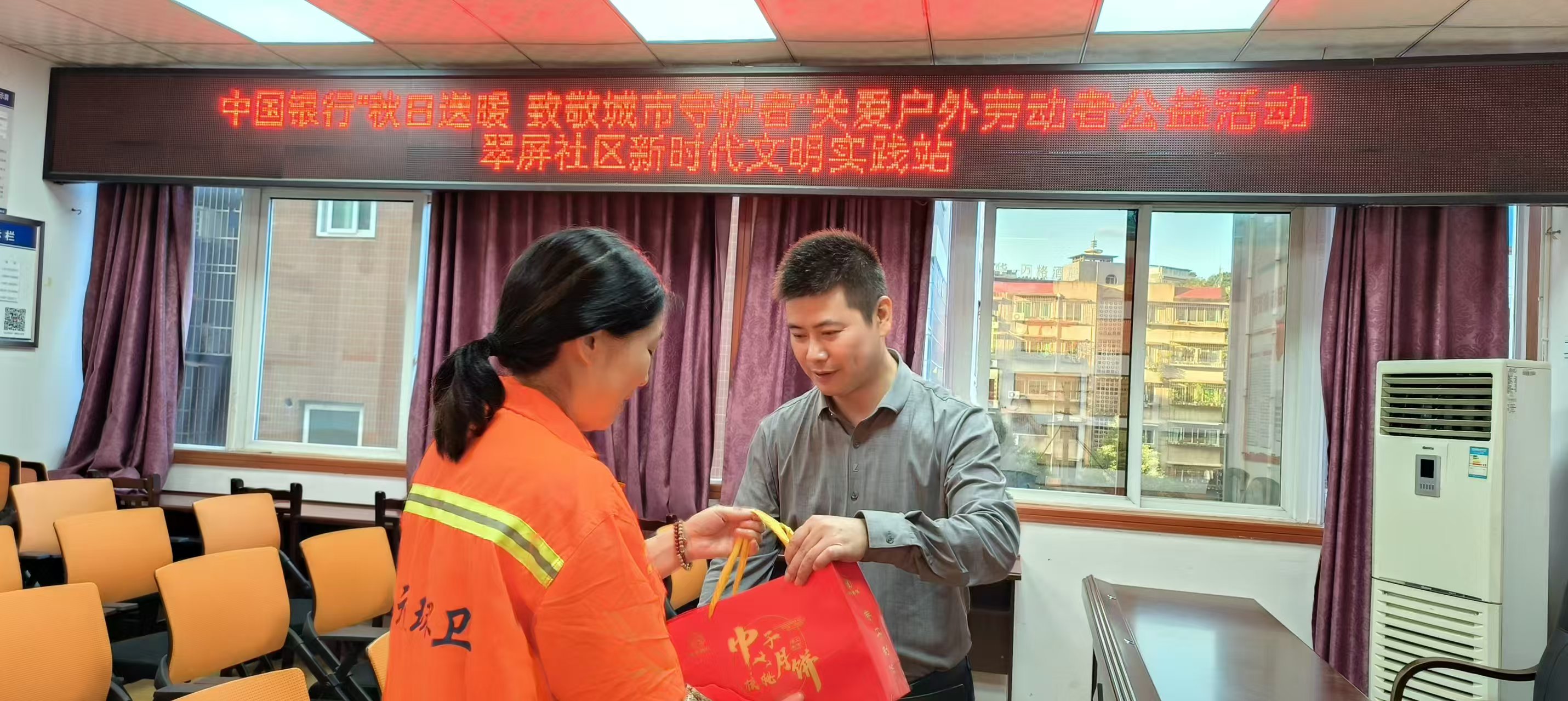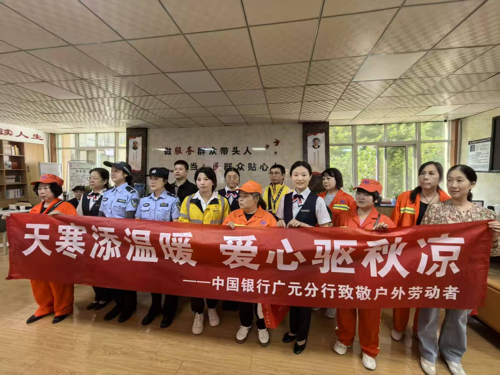 2025年9月25日,广元市利州区东坝街道翠屏社区携手中国银行人民路支行共同举办 “秋日送暖 致敬城市守护者” 公益活动,将关怀与温暖精准送达环卫工人、快递小哥、外卖骑手、交通警察、市政维修工、建筑工人等户外劳动者群体,以实际行动致敬他们不畏寒暑、坚守岗位的奉献精神。