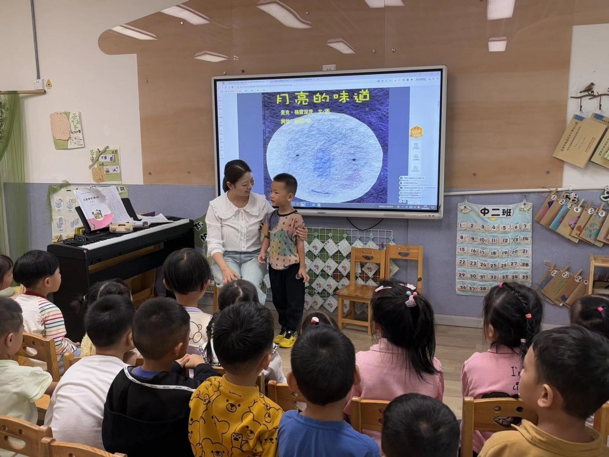 中班组聚焦知识与趣味并行:中一班通过图片、故事生动讲解赏月、吃月饼等习俗,互动抢答环节尽显幼儿对传统的好奇;中二班共读绘本《月亮的味道》,幼儿化身故事角色演绎情节,童真想象点亮现场;中三班“趣味灯谜会”热闹非凡,幼儿踊跃竞猜,在“猜谜夺宝”中体验动脑的乐趣。