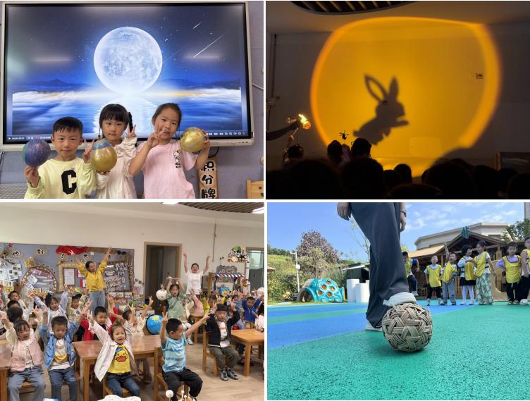 大班组主打传统与创意交融:大四班开展趣味蹴鞠活动,幼儿在奔跑竞技中感受古代体育的独特魅力;大三班以“诗词送祝福”传递温情,童声朗朗间为节日注入诗意;大二班玩转“中秋光影探秘”,用纸箱、手电筒等道具投射出兔子、月亮等造型,上演奇妙“光影魔术”;大一班幼儿巧手制作月球灯,气球、纸浆在指尖蜕变,一个个梦幻作品成为园内独特风景。