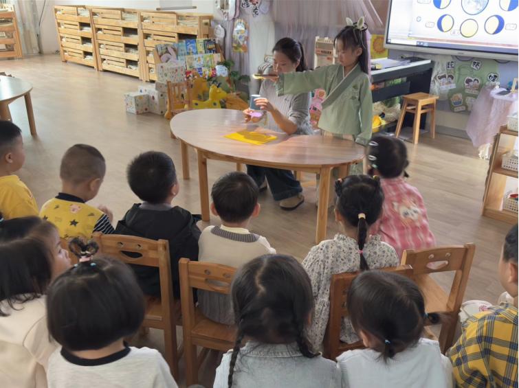 小班组则以萌趣与探索为主题:小一班开展“月相的变化”小实验,通过道具直观演示新月、弦月等形态,让幼儿近距离感受天文奥秘;小二班与小三班联合呈现《明月几时有》歌舞秀,萌娃身着特色服饰演绎古诗唱跳,尽显“古诗新唱”的活力。