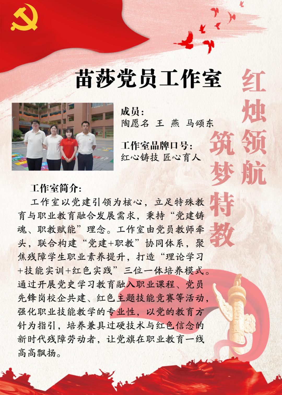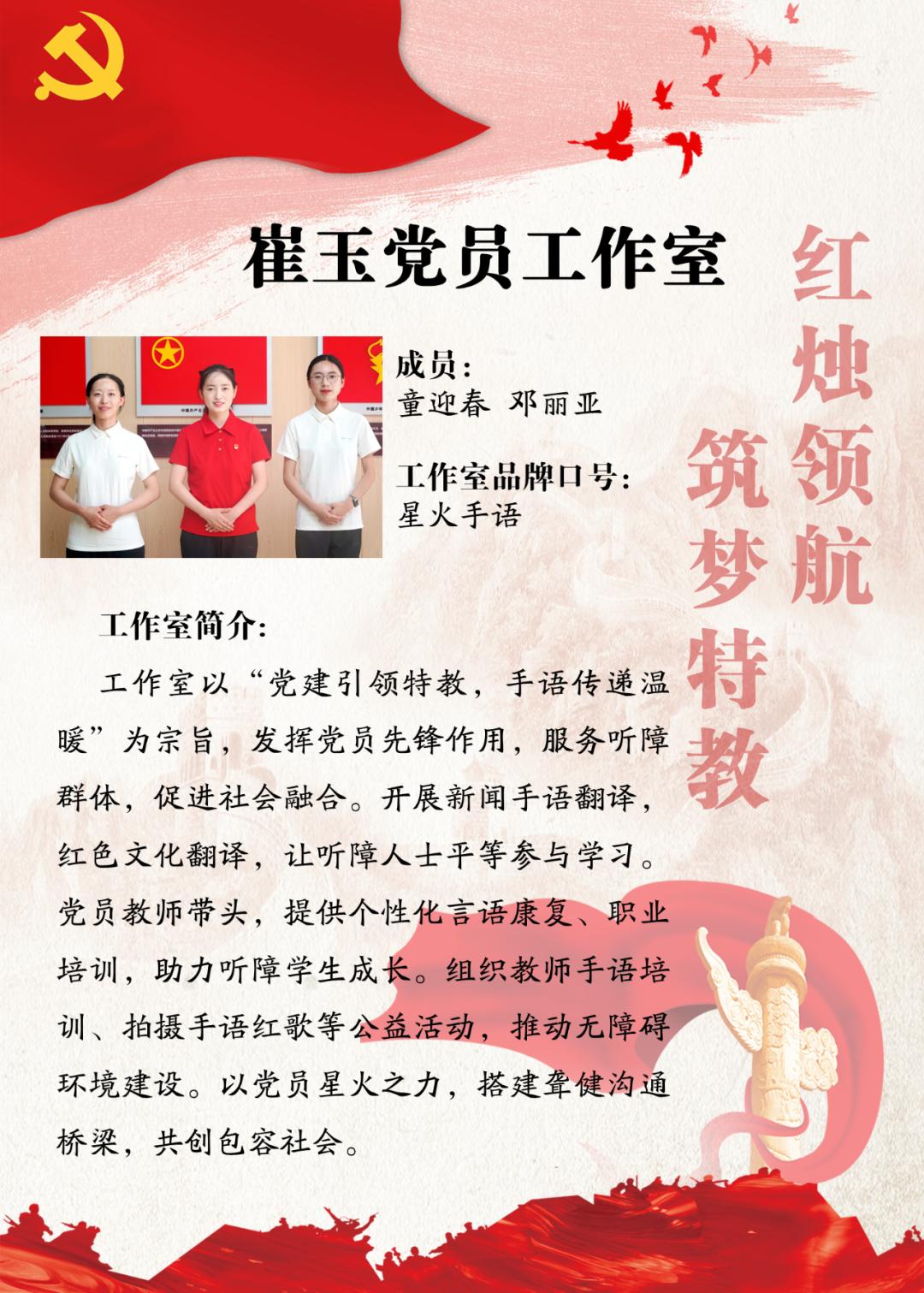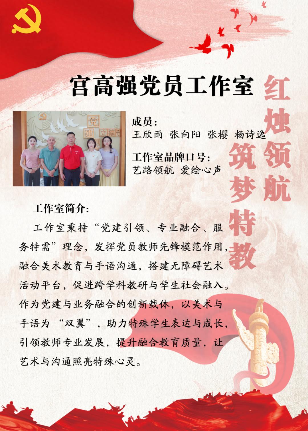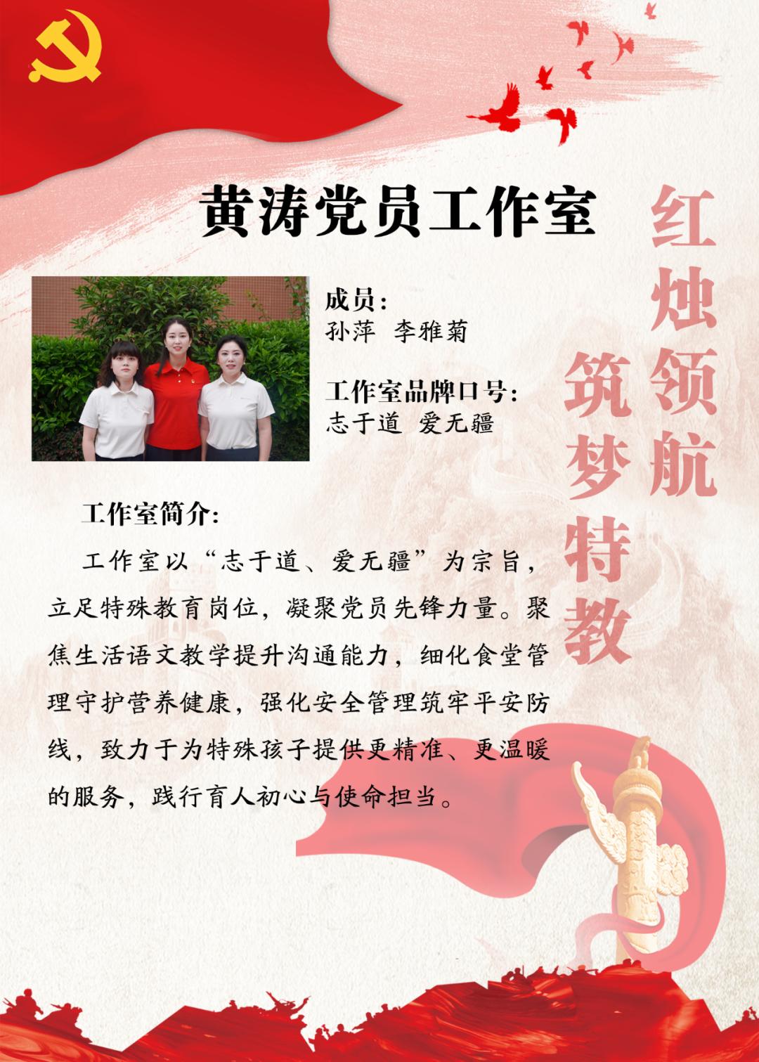 广元市特校党支部成立了以中层干部、校级领导为领衔人的党员工作室,成员为一线优秀中青年教师。通过党员工作室,旨在打造思想引领的“加油站”、教学改革的“先锋队”、师爱育人的“示范窗”以及青年成长的“孵化器”,以此助力特殊教育教学工作向纵深发展,带动教师专业成长,促进特殊学生更好地融入社会,全面推动学校实现高质量发展。