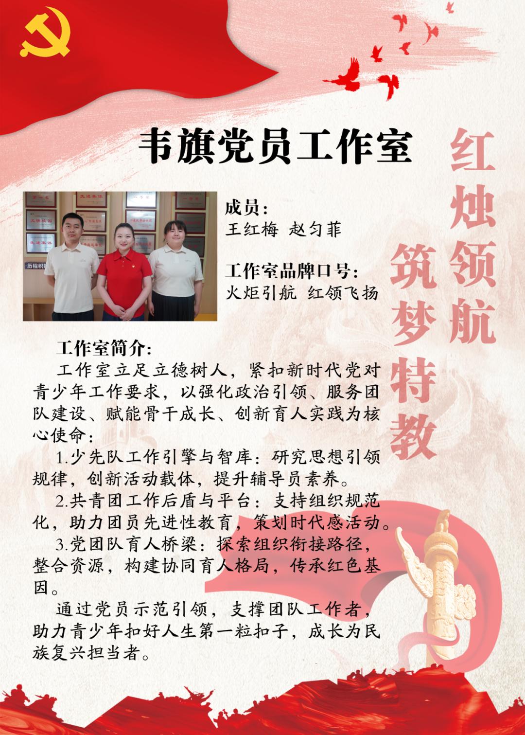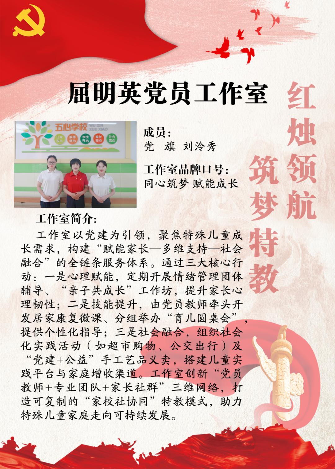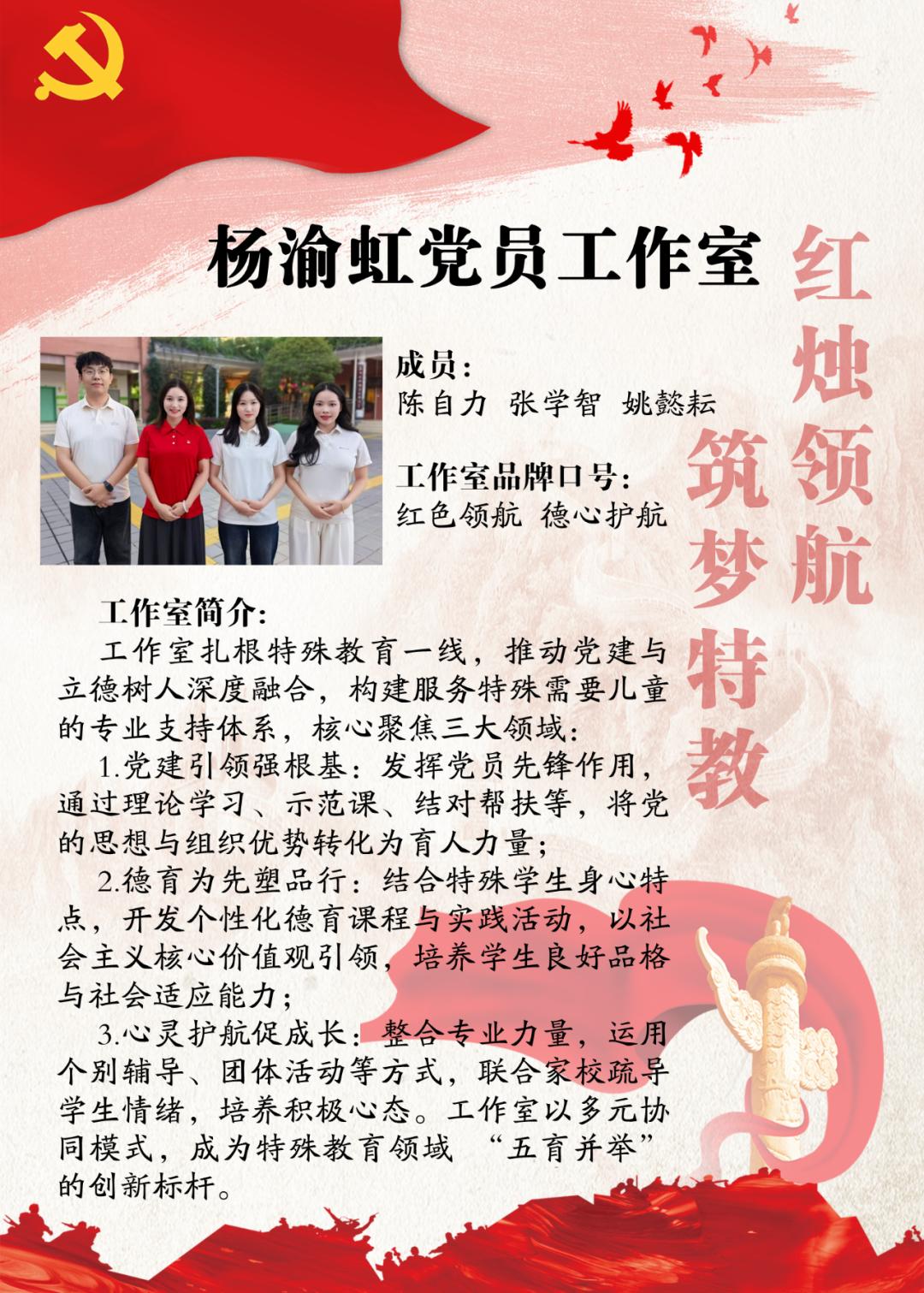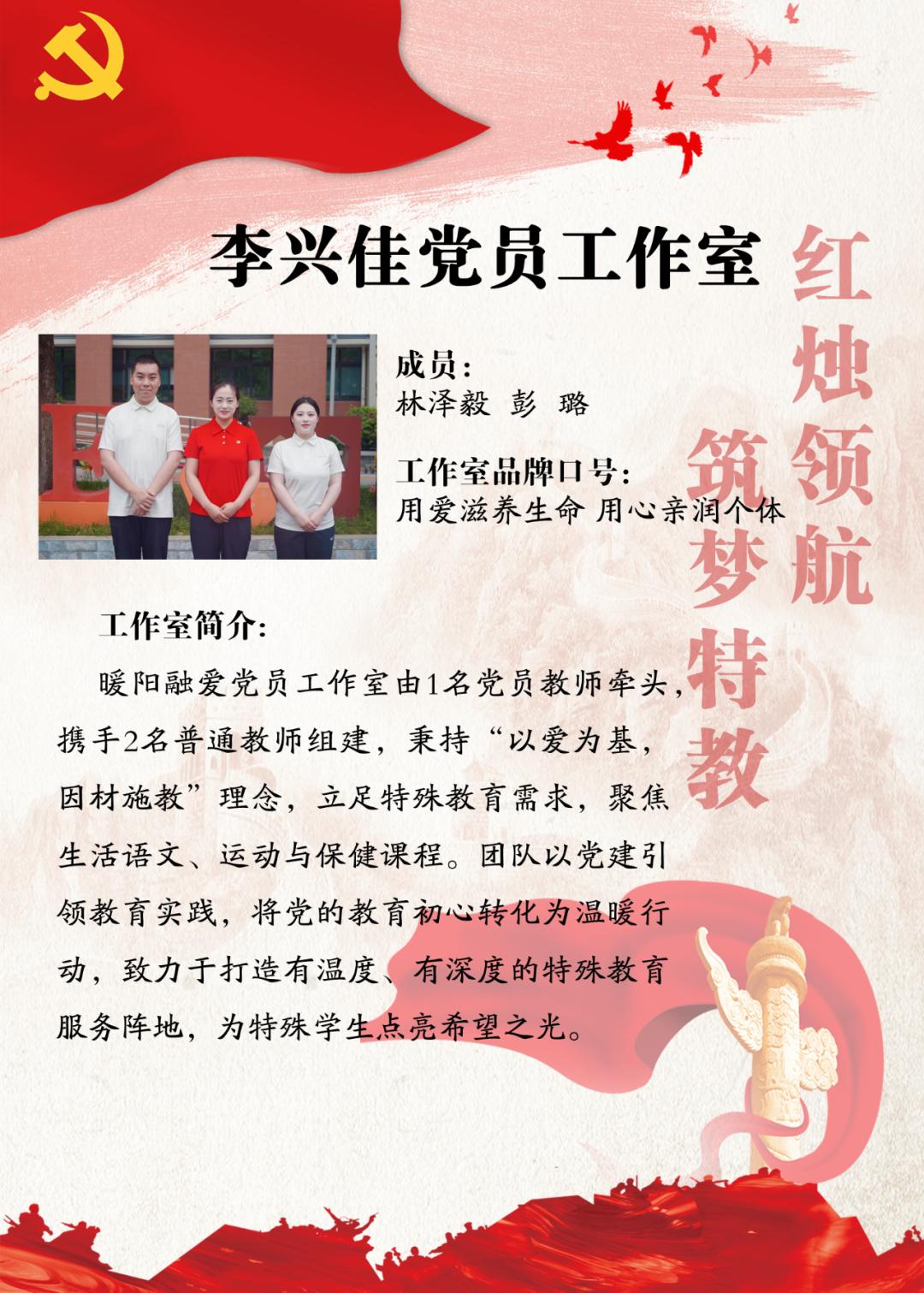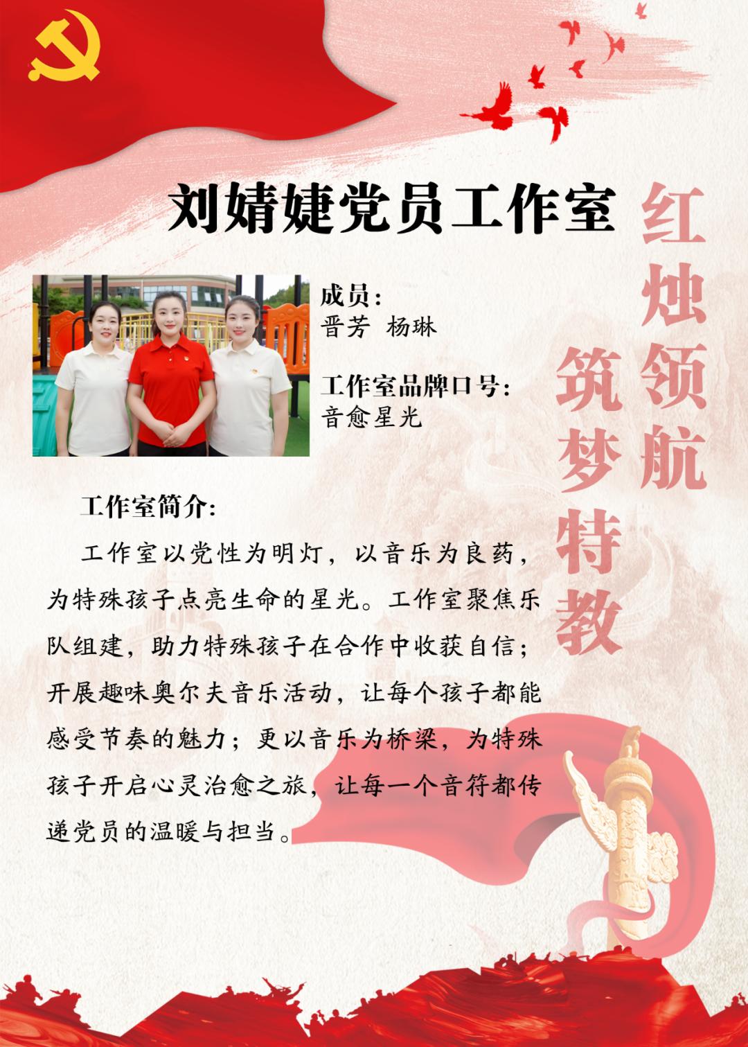 广元市特校党支部成立了以中层干部、校级领导为领衔人的党员工作室,成员为一线优秀中青年教师。通过党员工作室,旨在打造思想引领的“加油站”、教学改革的“先锋队”、师爱育人的“示范窗”以及青年成长的“孵化器”,以此助力特殊教育教学工作向纵深发展,带动教师专业成长,促进特殊学生更好地融入社会,全面推动学校实现高质量发展。