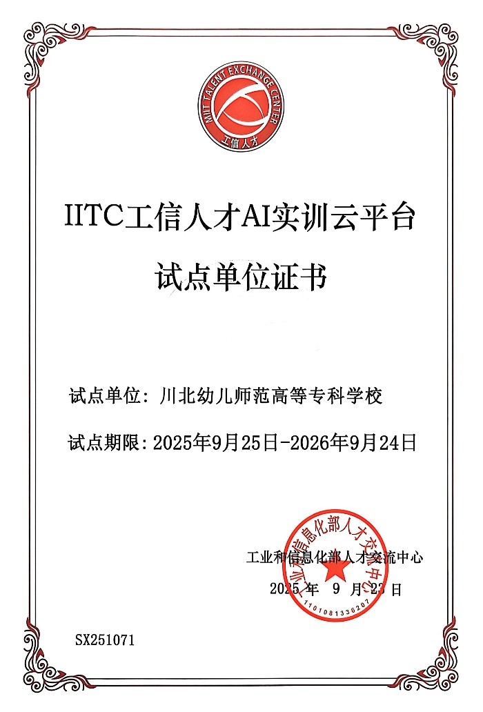 9月25日,工业和信息化部“IITC工信人才AI实训云平台”启动活动暨首批试点单位证书颁发仪式,在杭州“云栖大会”期间顺利举行。川北幼专党委委员、副校长罗勇带队参会,并代表学校领取首批试点单位证书,标志着川北幼专在人工智能领域实训教学与产教融合工作迈入新阶段。
