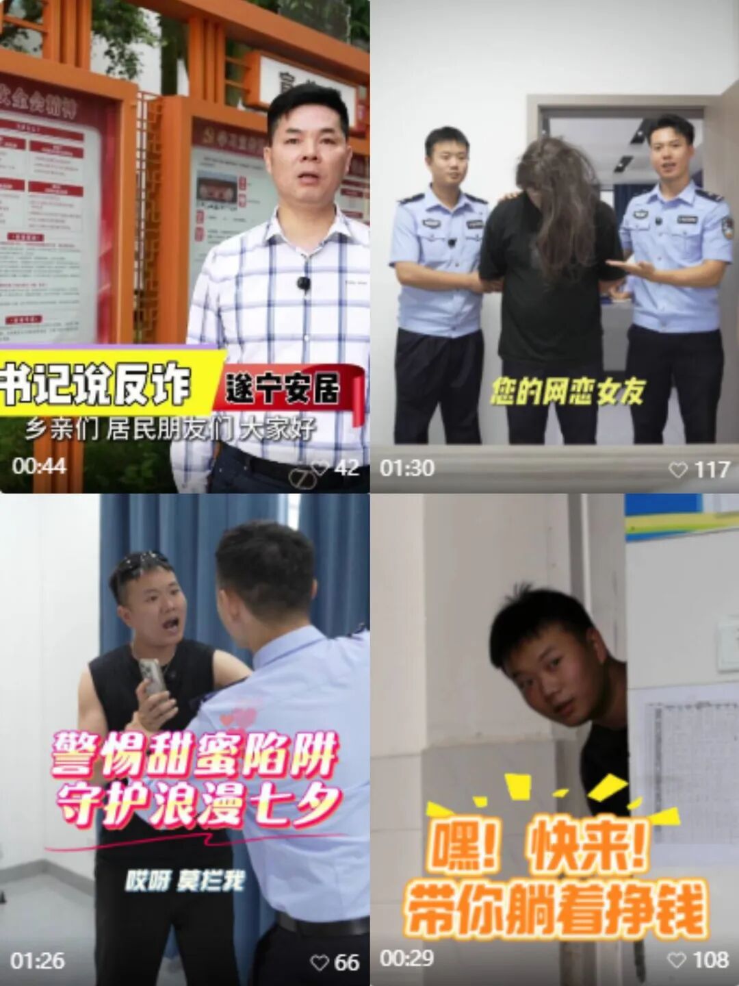 安居公安专门策划制作了一系列反诈主题短视频。这些视频以真实案例为蓝本,采用幽默风趣的语言和生动形象的画面,精准剖析刷单返利、虚假投资、冒充公检法等常见诈骗手法,将复杂的防骗知识转化为群众喜闻乐见的形式。系列视频通过官方新媒体平台及合作媒体广泛传播,累计播放量突破50万次,有效提升了反诈宣传的吸引力和覆盖面。