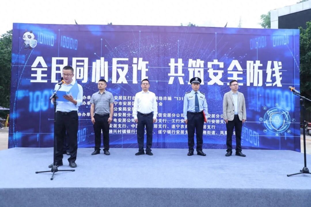 9月24日,遂宁市安居区头陀寺广场人潮涌动,一场以“全民同心反诈 共筑安全防线”为主题的反诈宣传月集中活动正式启动。此次活动旨在进一步提升广大群众防范电信网络诈骗的意识和能力,推动反诈知识深入人心。区委常委、政法委书记谭泊雨,副区长、区公安分局局长段勇强出席活动。