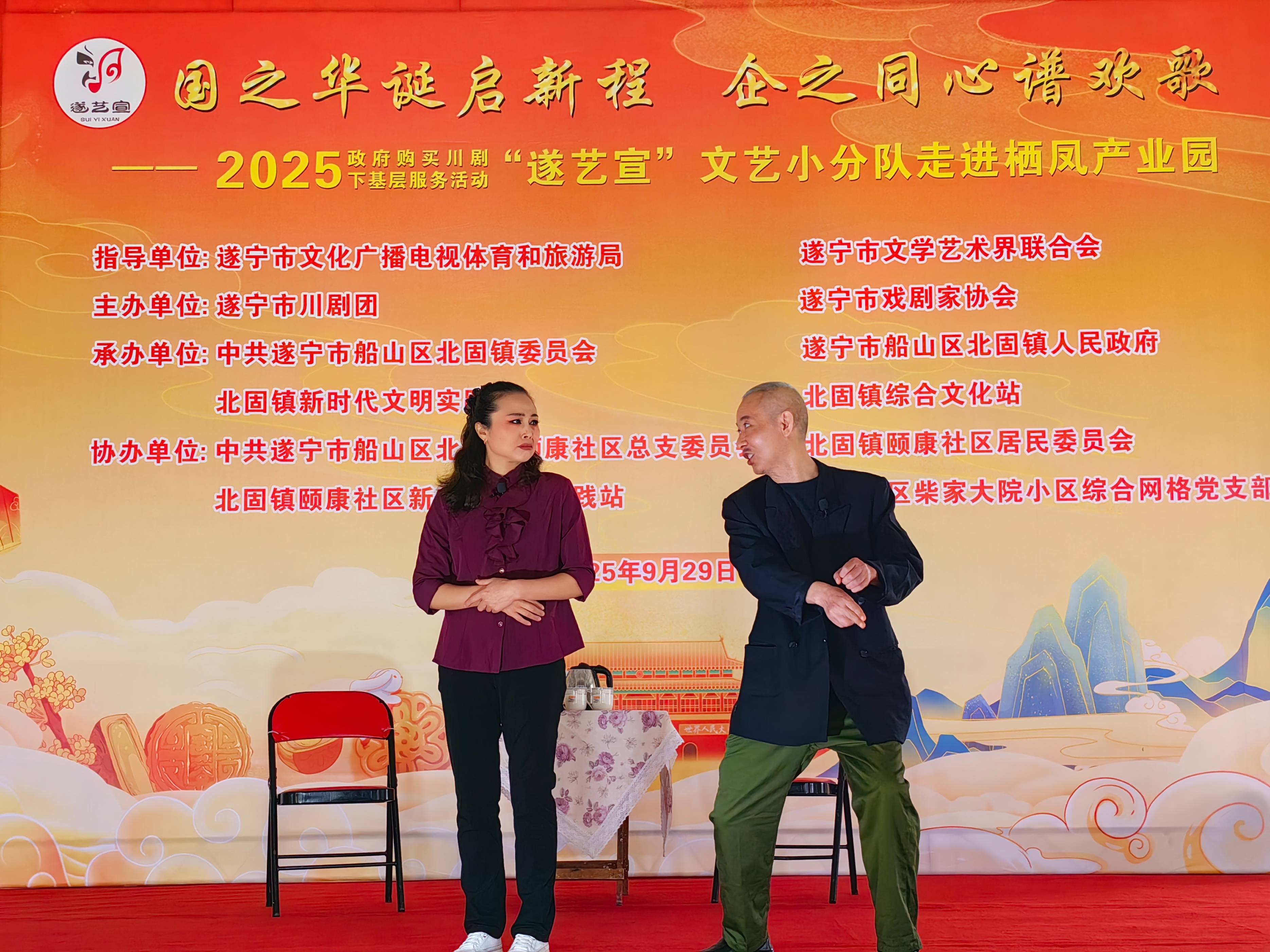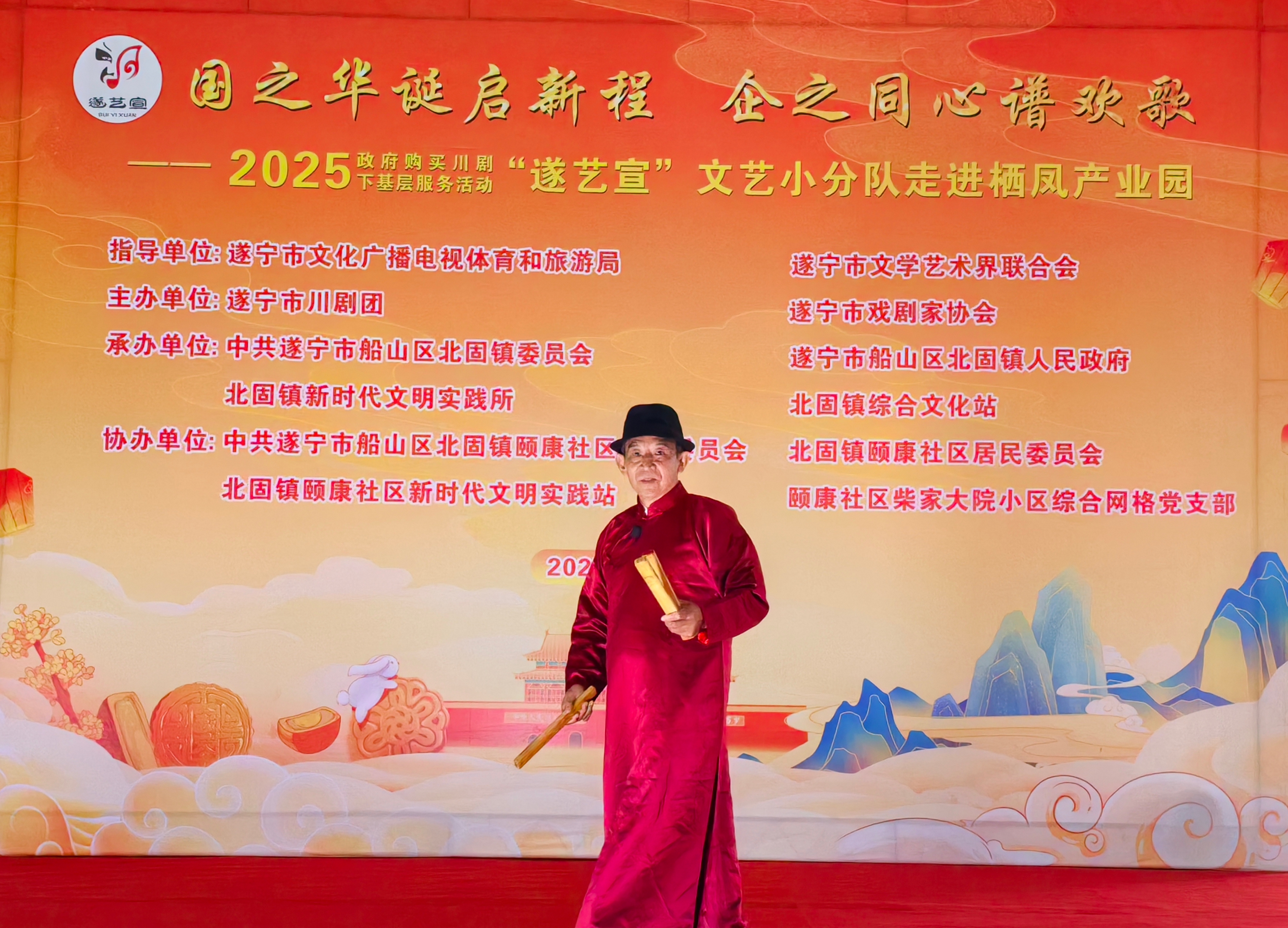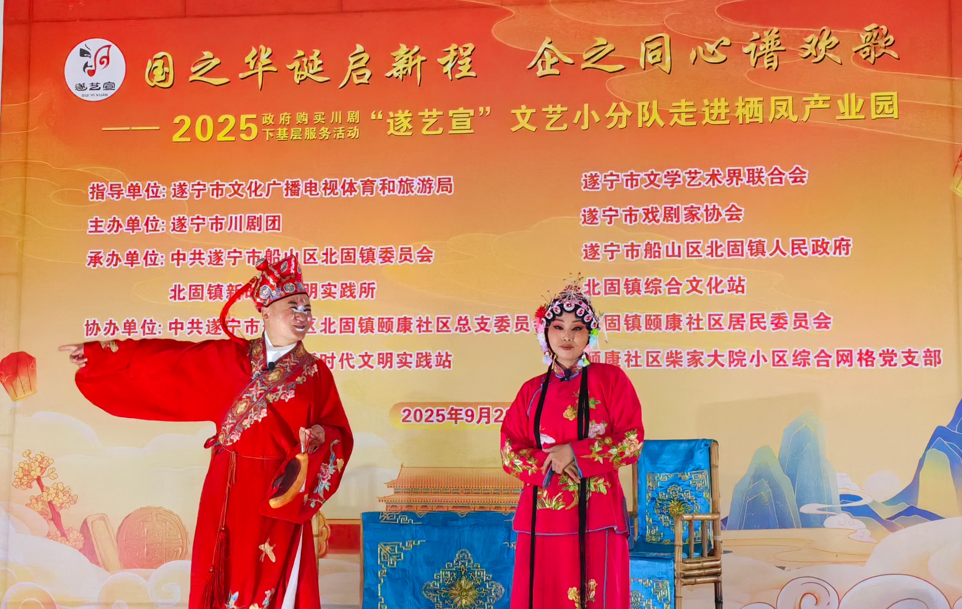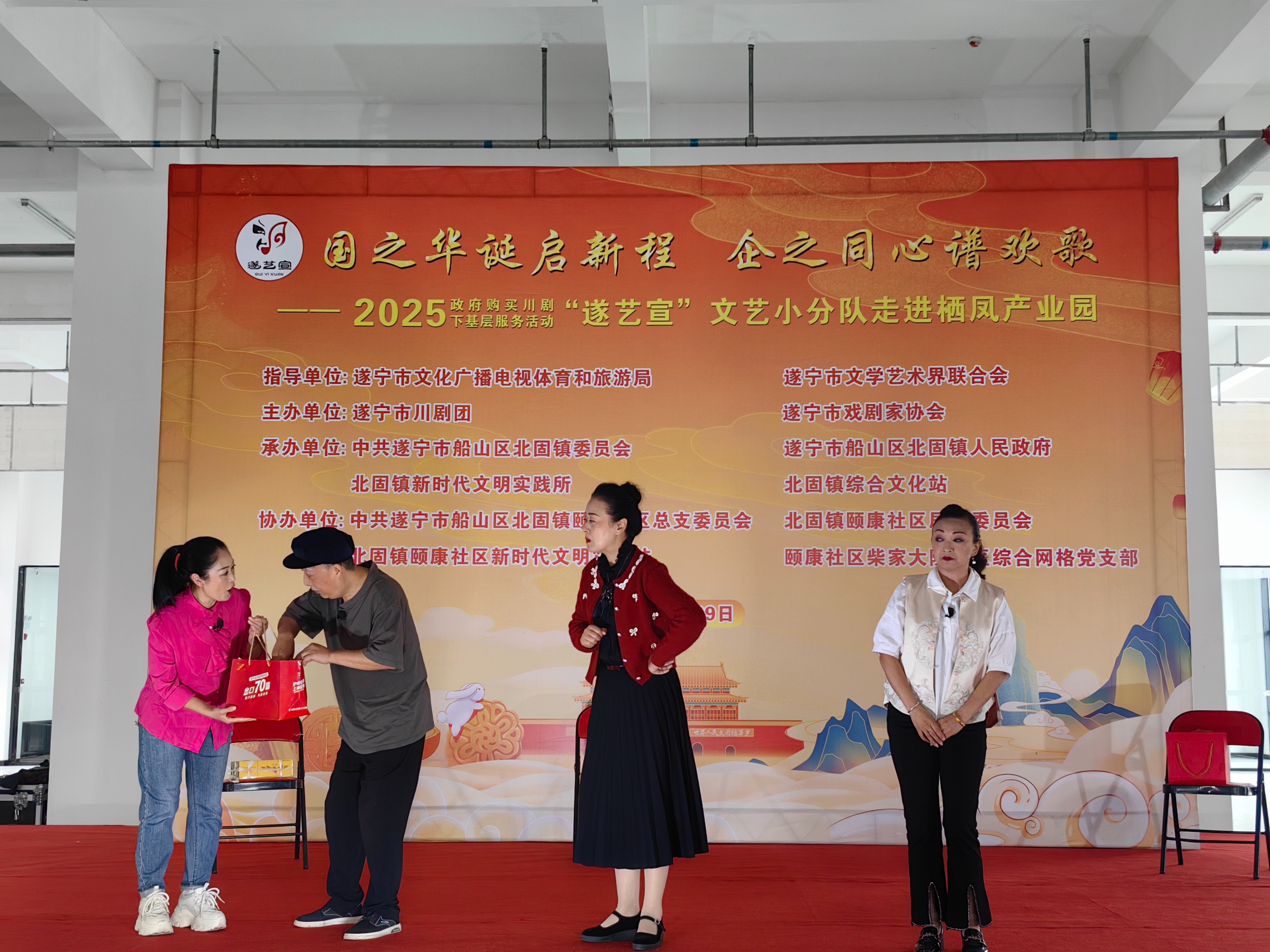 在国庆、中秋佳节即将到来之际(9月29日),一场以“国之华诞启新程 .企之同心谱欢歌”为主题的政府购买川剧下基层服务活动—一“遂艺宣”文艺小分队专场演出在船山区栖凤产业园举行。整台节目用群众喜闻乐见的艺术形式,为园区职工与周边居民送上了一场兼具文化韵味与时代气息的视听盛宴。