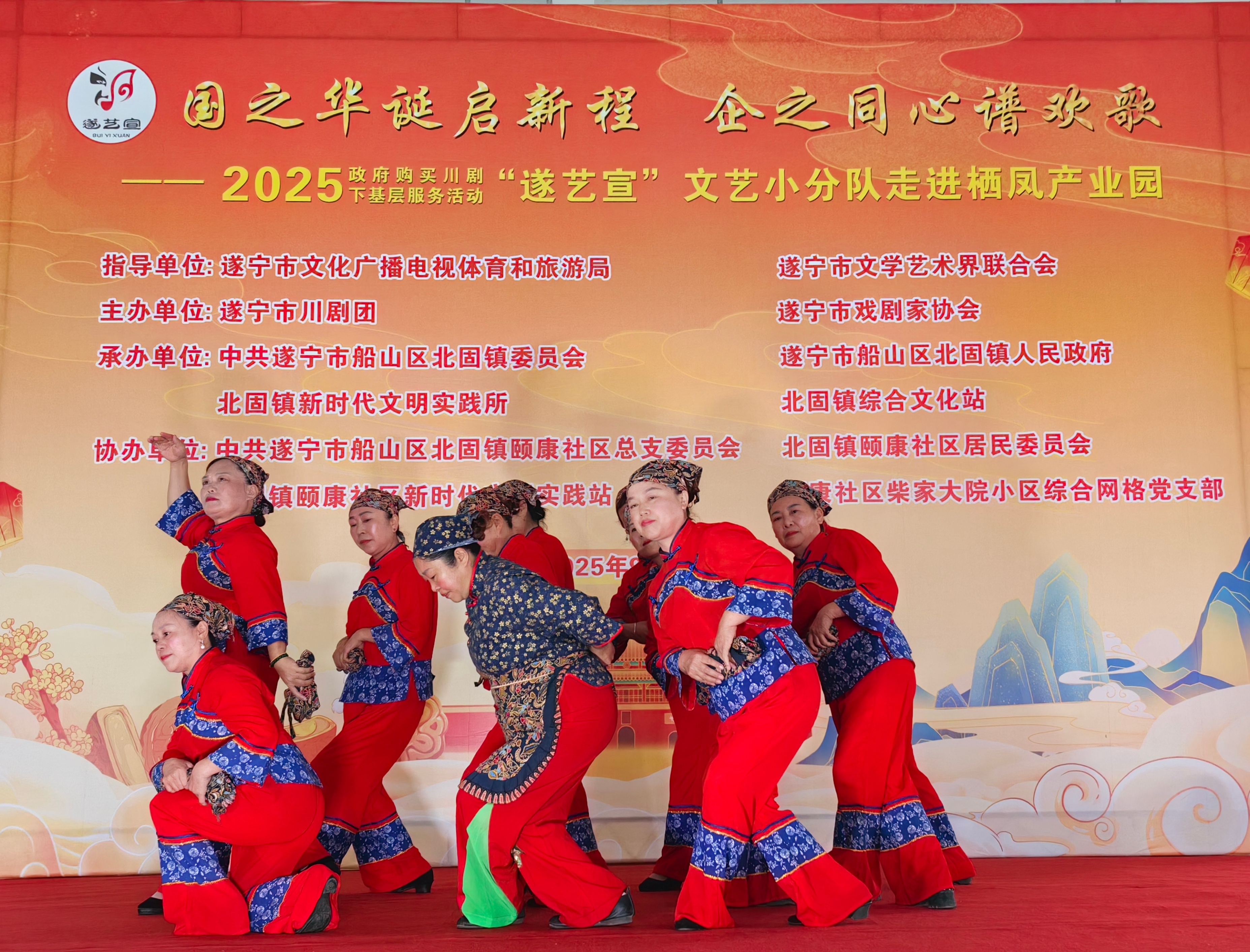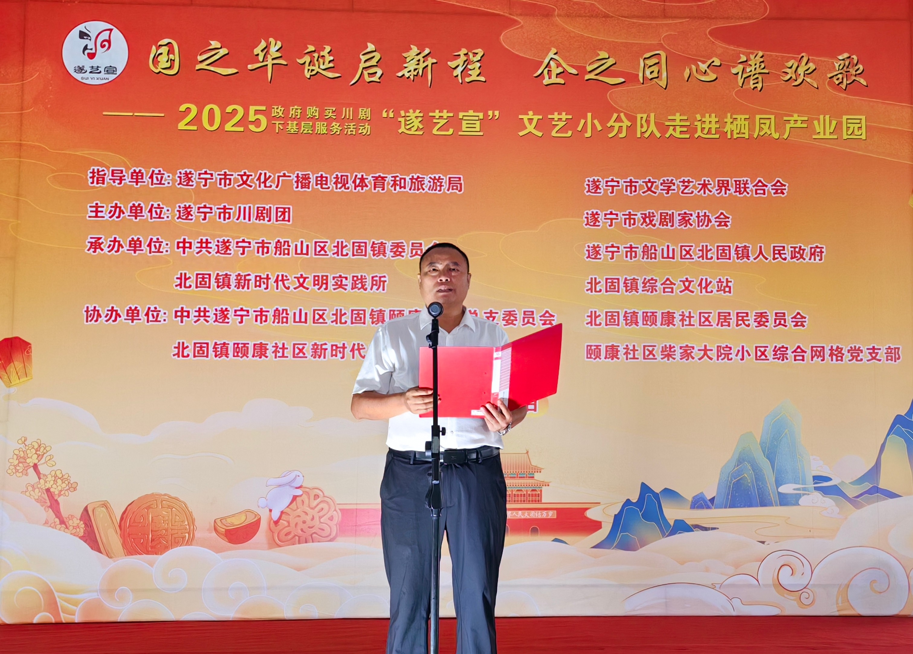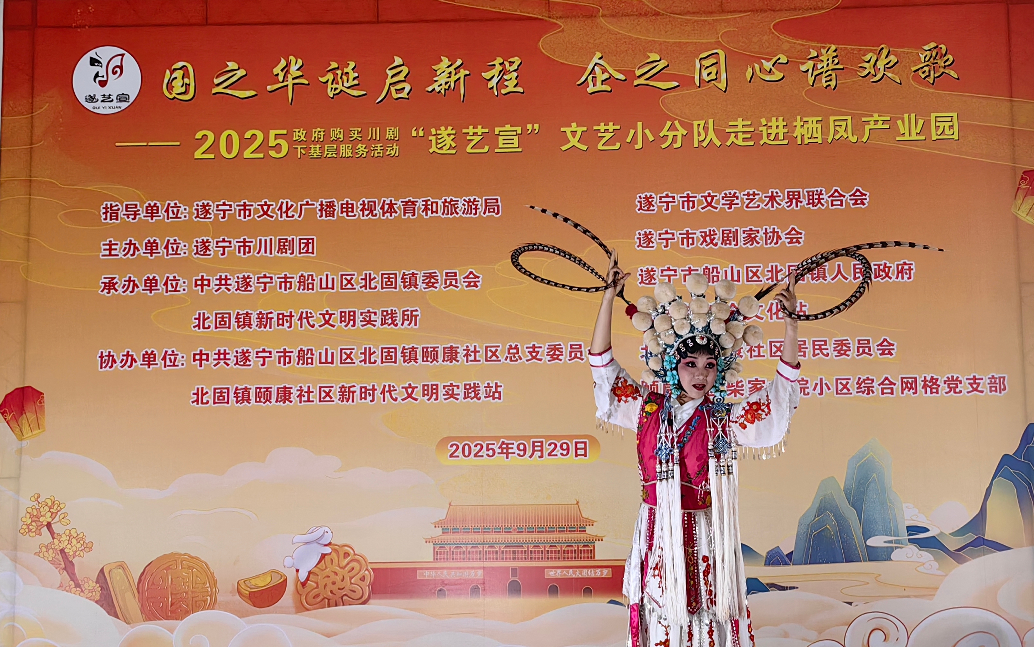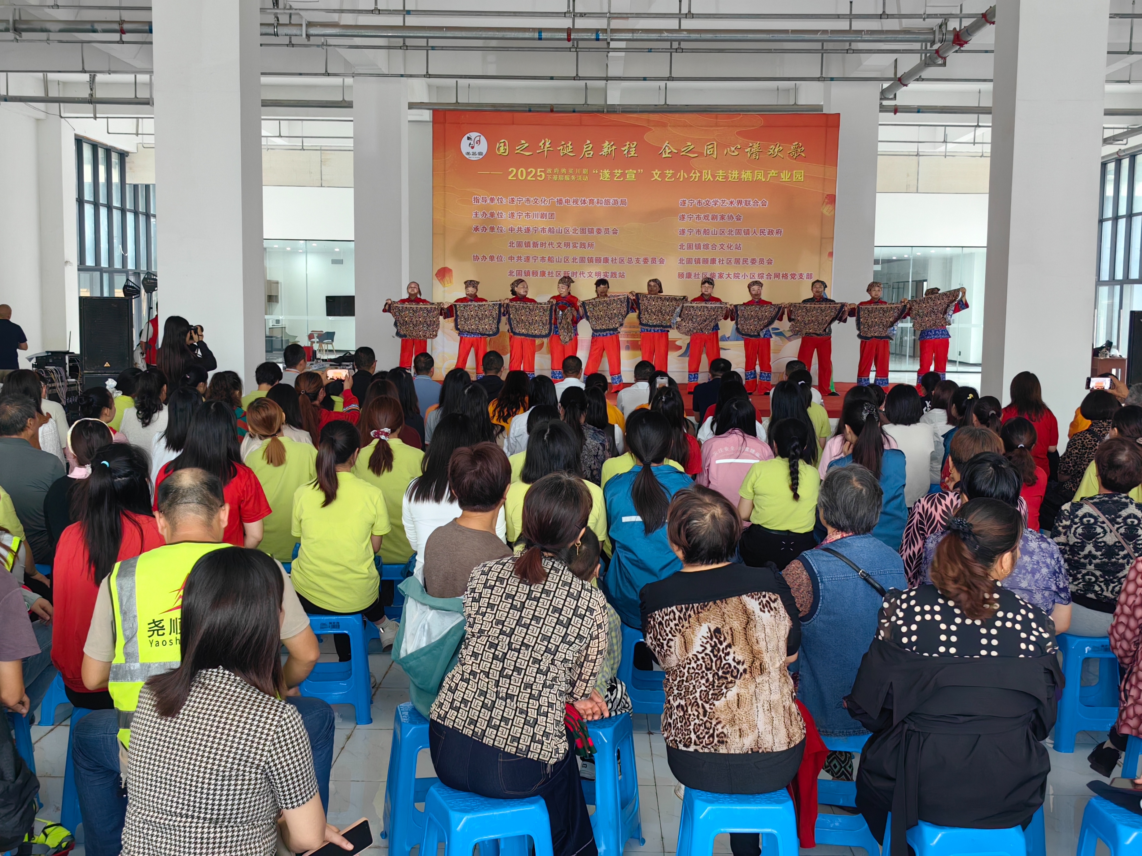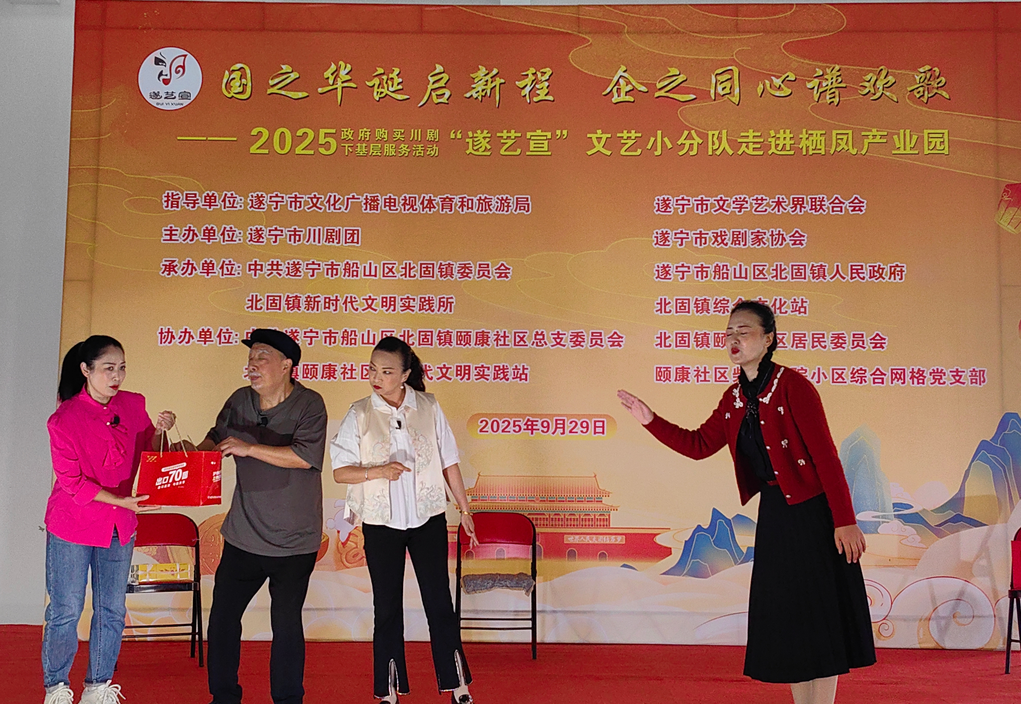 在国庆、中秋佳节即将到来之际(9月29日),一场以“国之华诞启新程 .企之同心谱欢歌”为主题的政府购买川剧下基层服务活动—一“遂艺宣”文艺小分队专场演出在船山区栖凤产业园举行。整台节目用群众喜闻乐见的艺术形式,为园区职工与周边居民送上了一场兼具文化韵味与时代气息的视听盛宴。