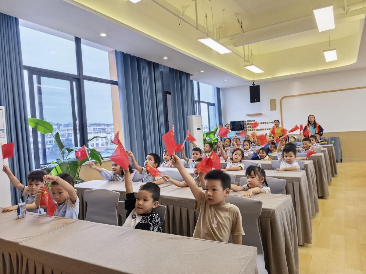 活动分为全园活动和班级活动,在庄严的升旗仪式中全园活动正式开启,园长致辞、幼儿讲话、学习手势舞等活动让孩子们感受到了中秋节和国庆节浓浓的氛围。随后的分班活动中,孩子们学习了关于国庆和中秋的相关知识,懂得了爱祖国,爱家乡。最后在老师带领下制作月饼、玩创意黏土《红旗下、月儿圆》、做趣味游戏《玉兔插红旗》表达对祖国的祝福。