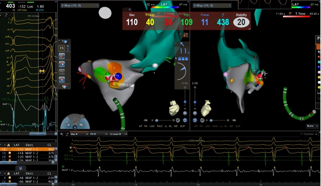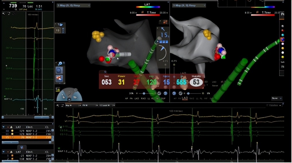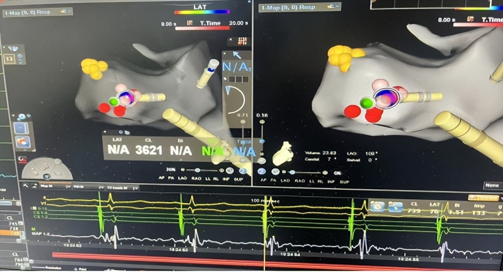 手术的关键,是找到心脏里的“异常激动点”。郑全主任团队通过股动脉送入射频导管,在三维导航仪指引下,在心脏主动脉瓣二尖瓣连接处(AMC区域)精准定位。