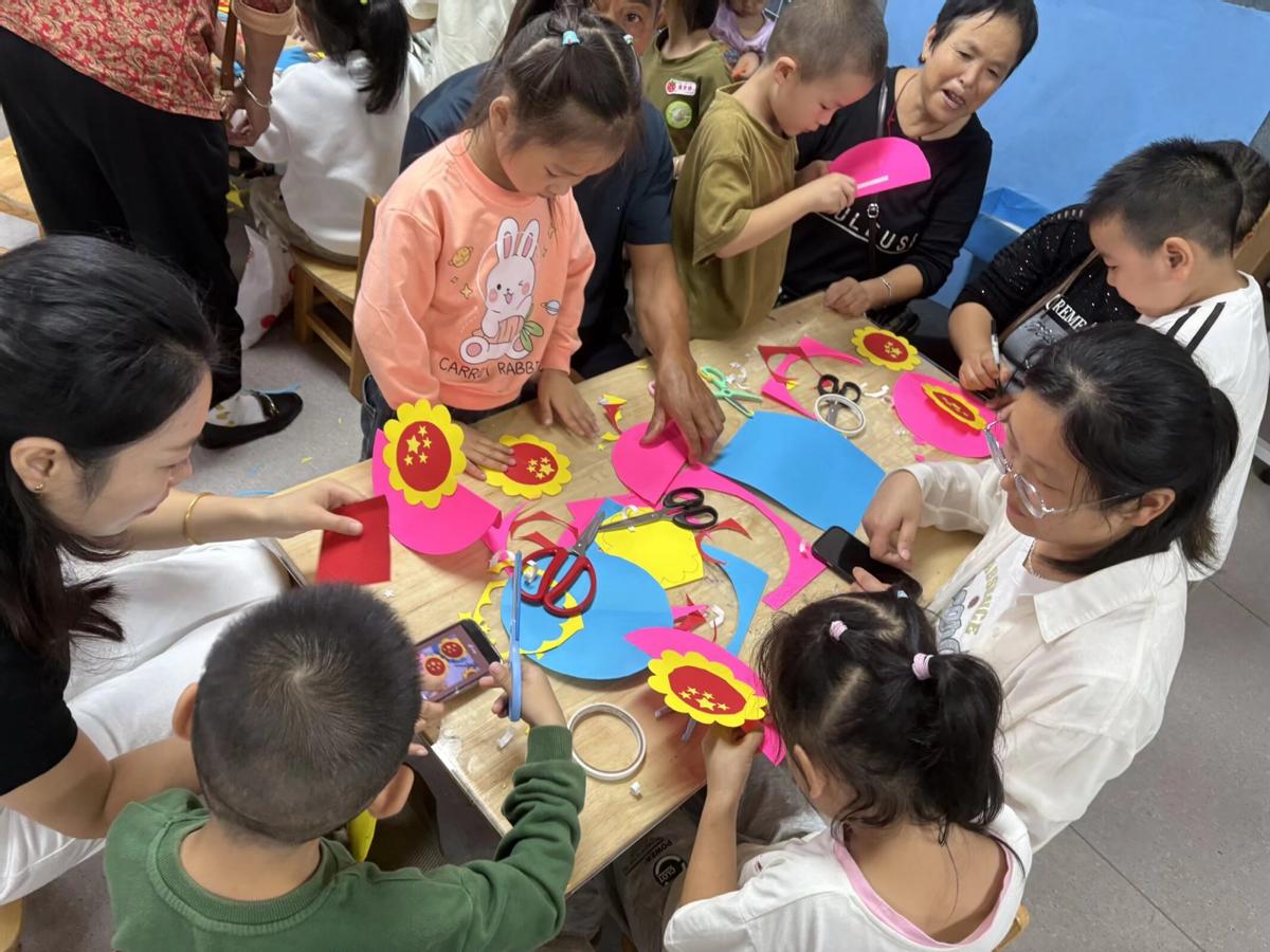 在“庆国庆迎中秋”亲子手工环节,家长与孩子共同制作手工、贴画和贺卡,欢声笑语不断。温馨的创作场景成为活动亮点,家长们手持作品拍照留念,定格美好瞬间。