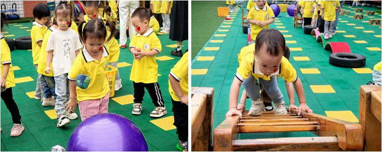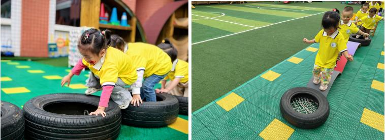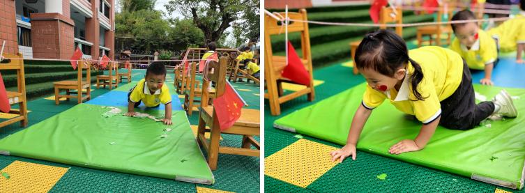 《躲避探照灯》中,幼儿依次在绿色地垫上匍匐前进,躲避老师用绳子模拟的“探照灯”,同时绕过场地内的障碍物。最后是《跨越障碍》,将爬行垫搭成小山的样子,幼儿排队有序的双脚跳过障碍物。